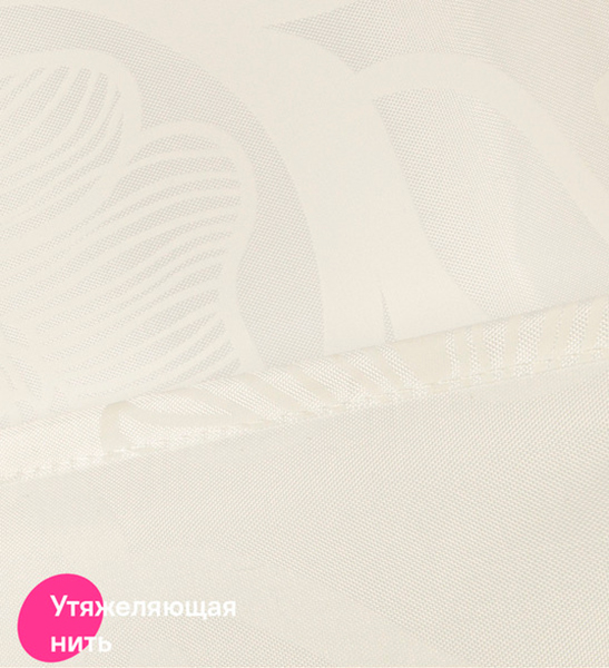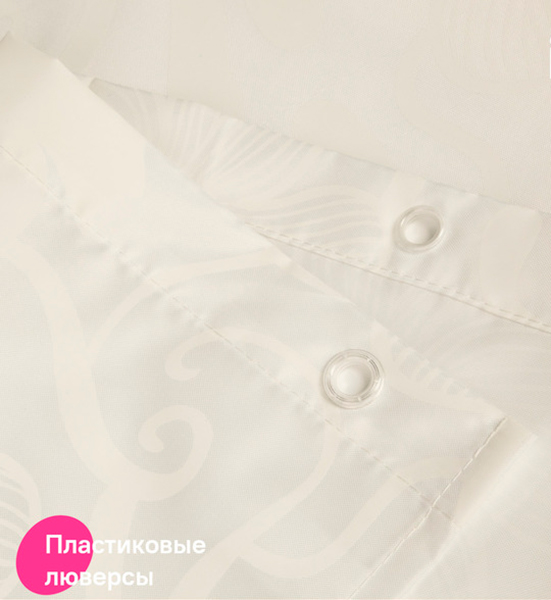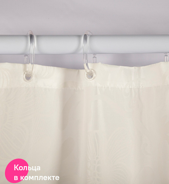 В комплекте 12 колец С-формы из прозрачного пластика. По верхнему краю расположены 12 прозрачных пластиковых люверсов. Штора имеет утяжеляющую нить по нижнему краю, которая позволяет избежать задирания ткани.