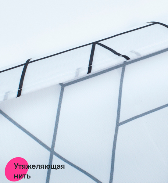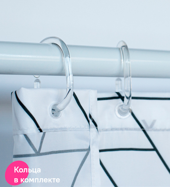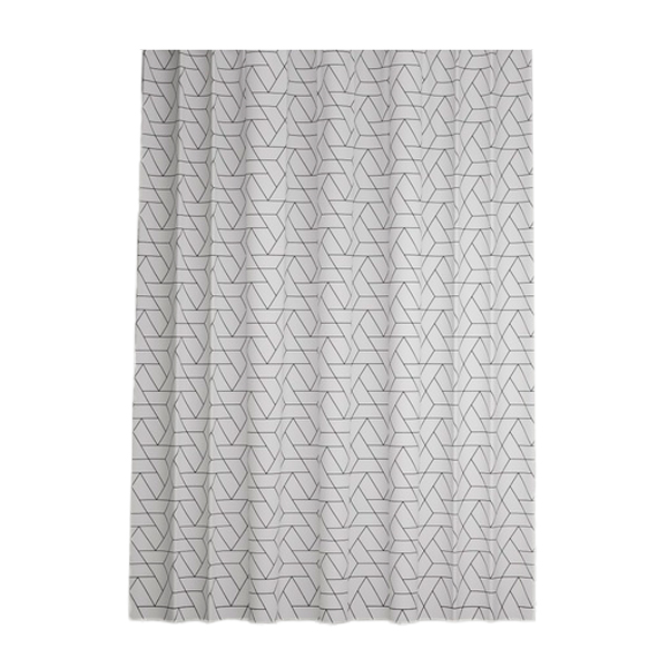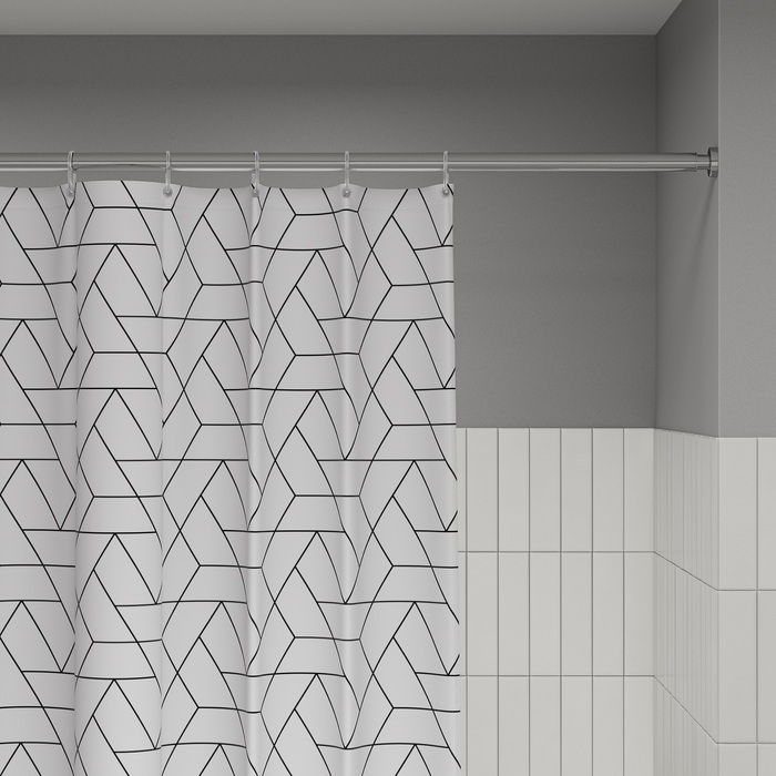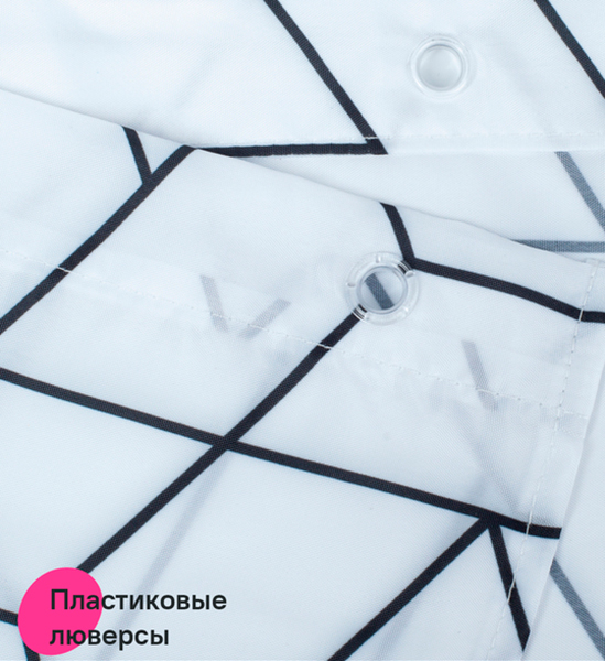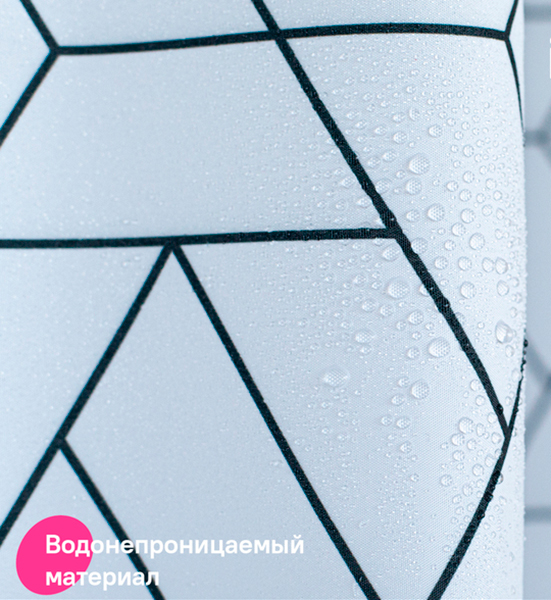 Текстильная штора для ванной белого цвета с черным геометричным принтом. Изготовлена из износостойкого полиэстера с водоотталкивающей пропиткой. При попадании на ткань вода не впитывается, а скатывается каплями, даже при сильном напоре воды.