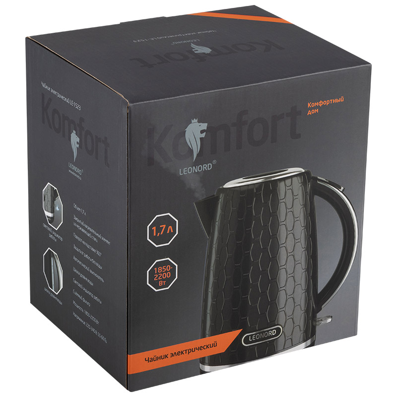 Мощность 1850-2200 Вт. Объем 1,7 л. Корпус из пластика. Закрытый нагревательный элемент из нержавеющей стали. Поворот на подставке 360°. Защита от работы без воды Автоматический выключатель. Шкала уровня воды. Световой индикатор работы. Съемный фильтр. Гарантия 2 года. Длина шнура 72 см.