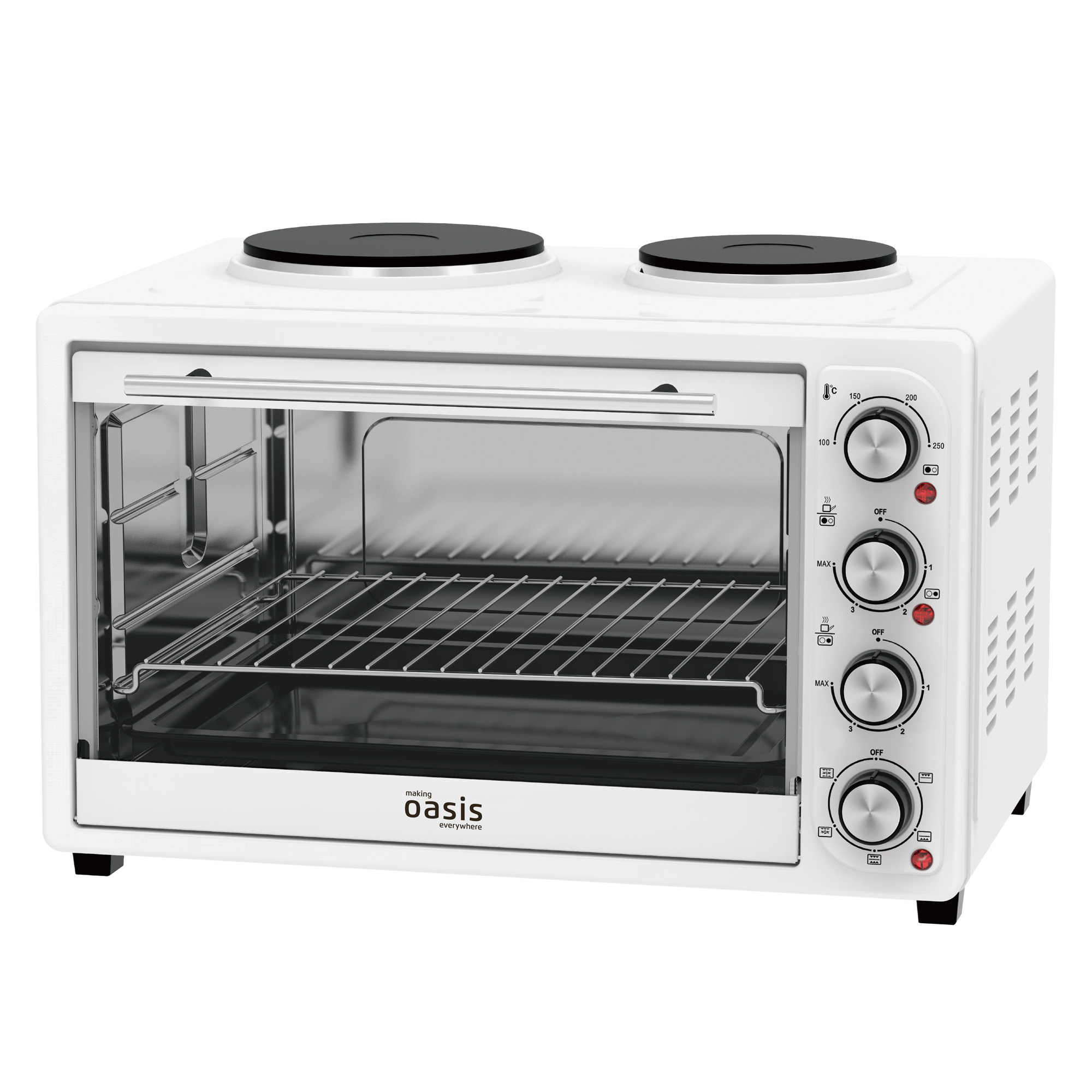 Электрическая мини-печь making Oasis everywhere со встроенными конфорками — это универсальное решение, которое способно заменить сразу духовой шкаф и варочную панель. Устройство актуально в условиях небольшого помещения, например дома без кухни, где нет возможности установить два кухонных прибора, но при этом не хочется ограничивать себя в приготовлении блюд. Функция конвекции обеспечивает равномерную циркуляцию горячего воздуха, благодаря чему блюда пропекаются идеально — без подгоревших краёв и сырых середин.