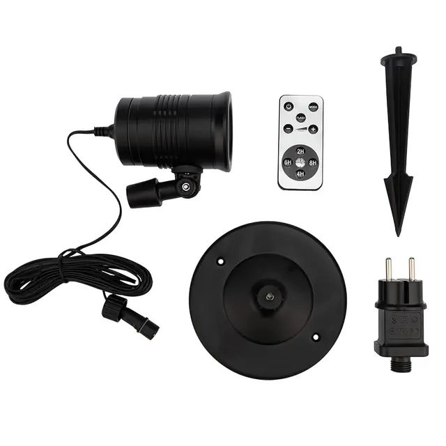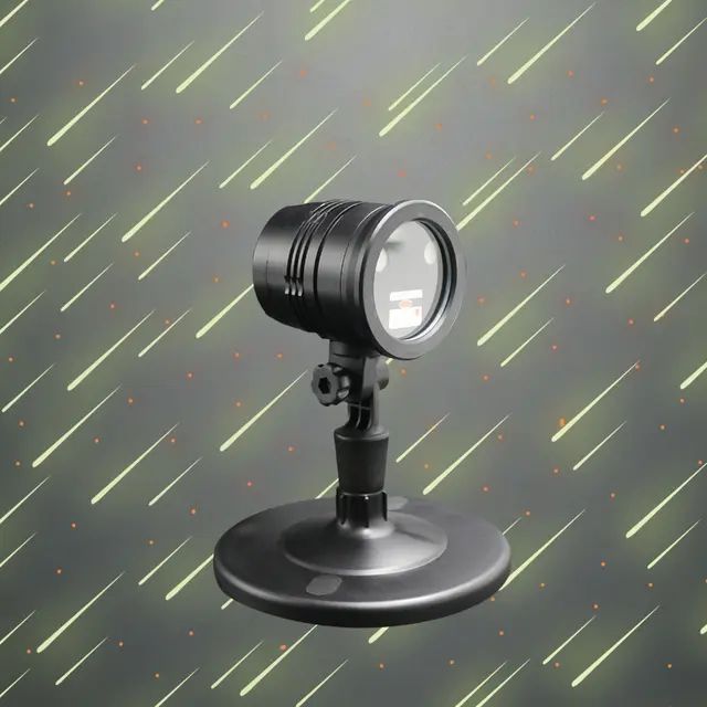 Лазерный проектор «Метеоритный дождь» с пультом дистанционного управления защищен от воздействия влаги и пыли по стандарту IP44 — подходит для использования как дома, так и на улице. Подставка с отверстиями для крепежа устанавливается на любую ровную поверхность, специальный колышек предназначен для размещения в грунте.