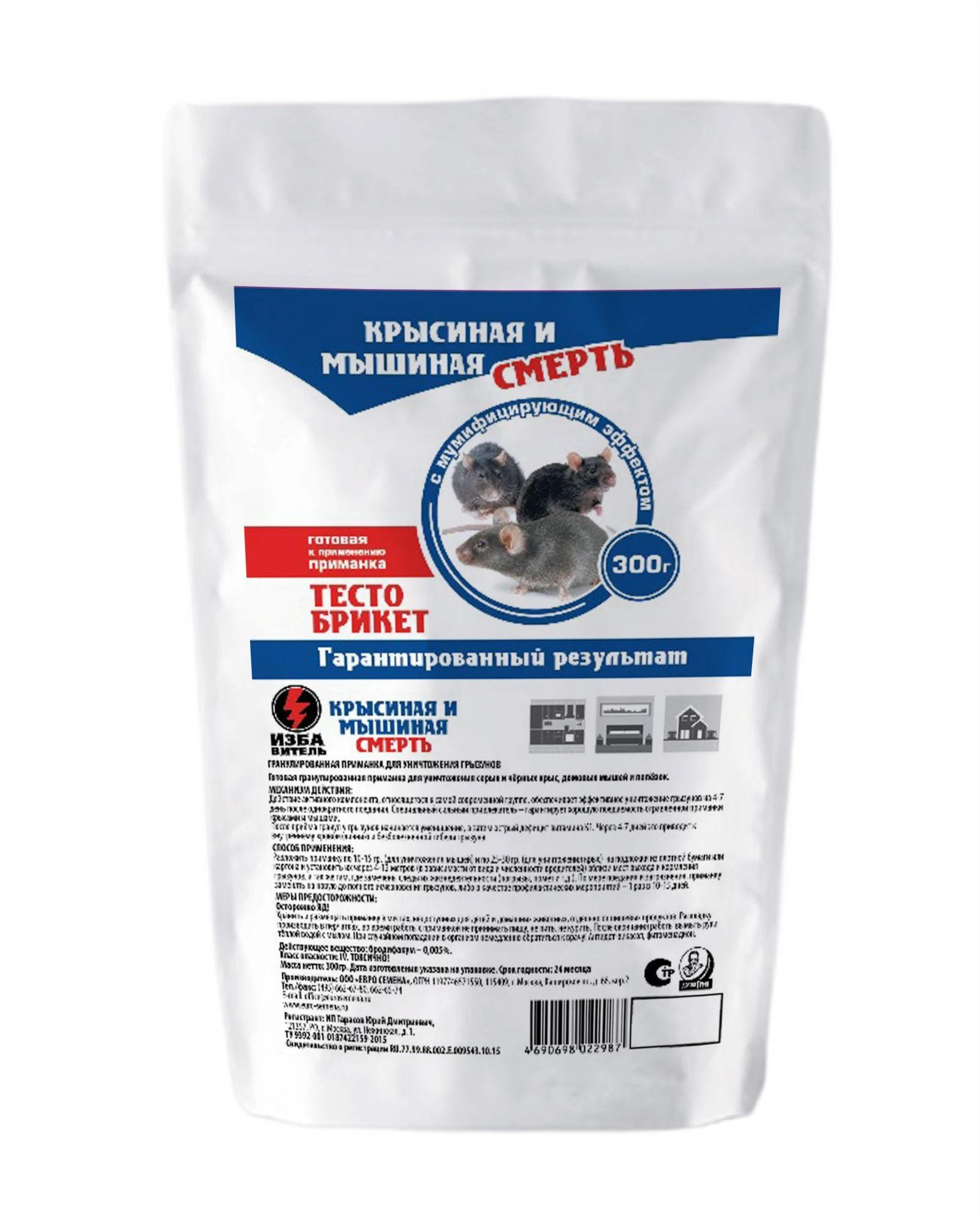Готовая пищевая отравленная приманка с мумифицирующим эффектом для уничтожения серых и черных крыс, домовых мышей, полевок и других мышевидных грызунов для применения населением в быту. Действие активного компонента, относящегося к самой современной группе, обеспечивает эффективное уничтожение грызунов на 4-7 день после однократного поедания.