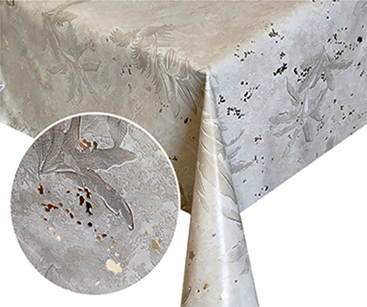Клеенка PRIMA DIVA на тканой основе состоит из двух слоев: верхний слой – ПВХ, на котором нанесен рисунок, нижний слой – тканая основа из полиэстера. Дизайн – однотонный фон или фон с имитацией «мрамора» с печатным металлизированным или голографическим узором. Поверхность клеенки гладкая полуглянцевая с металлизированными элементами.