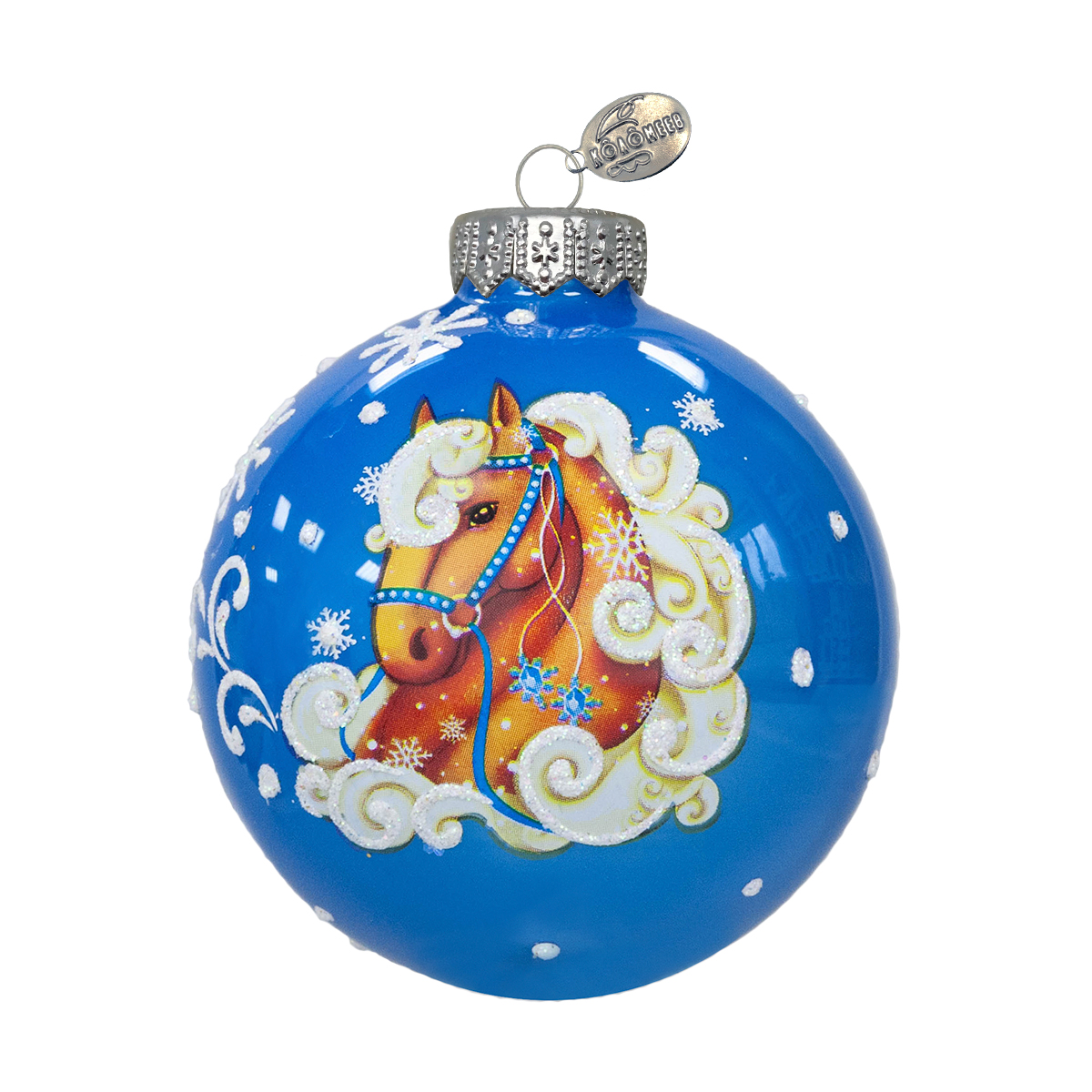 Елочный шар из стекла диаметром 65 мм станет прекрасным украшением праздничного интерьера благодаря изображению символа наступающего 2026 года — Лошади. Основное изображение лошади наносится на шар методом полноцветной термопечати, обеспечивающим высокую детализацию и стойкость рисунка. Каждый шар также проходит ручную доработку художником, что добавляет уникальные декоративные элементы. Благодаря своей оригинальности и качеству исполнения этот елочный шар станет отличным подарком для близких и друзей.