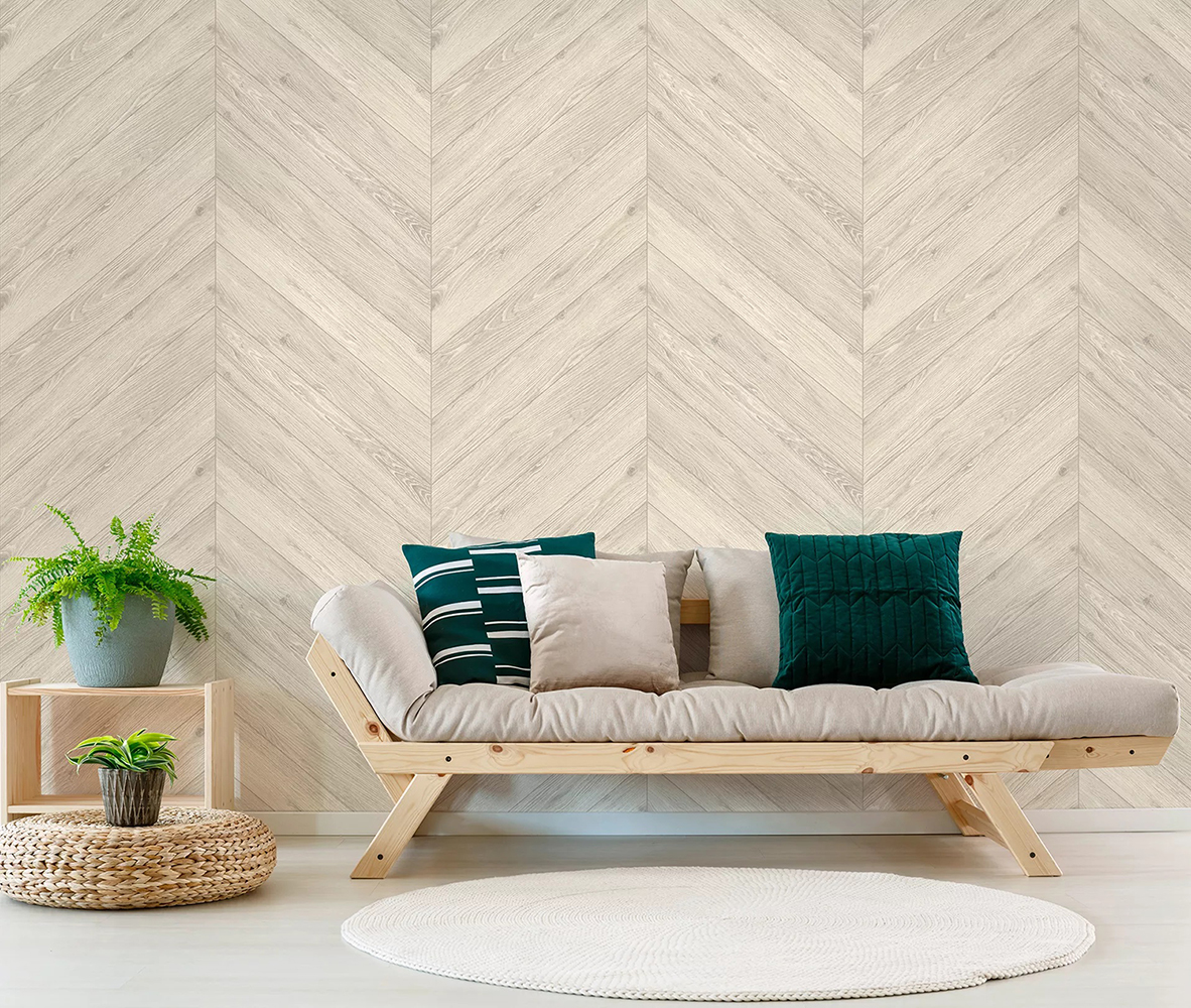 Деревянные доски в натуральных оттенках, паркетный дизайн «ёлочка» – коллекция «Вуд», оригинальное решение для интерьера. Обои с роскошной матовой фактурой дерева – хорошая альтернатива натуральному материалу. Текстура древесины привносит в интерьер уют и тепло, сочетается с различными натуральными фактурами и текстилем.