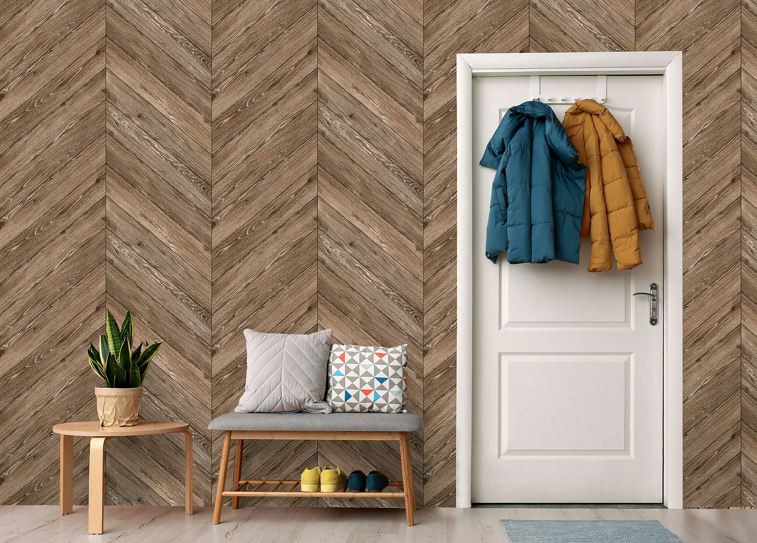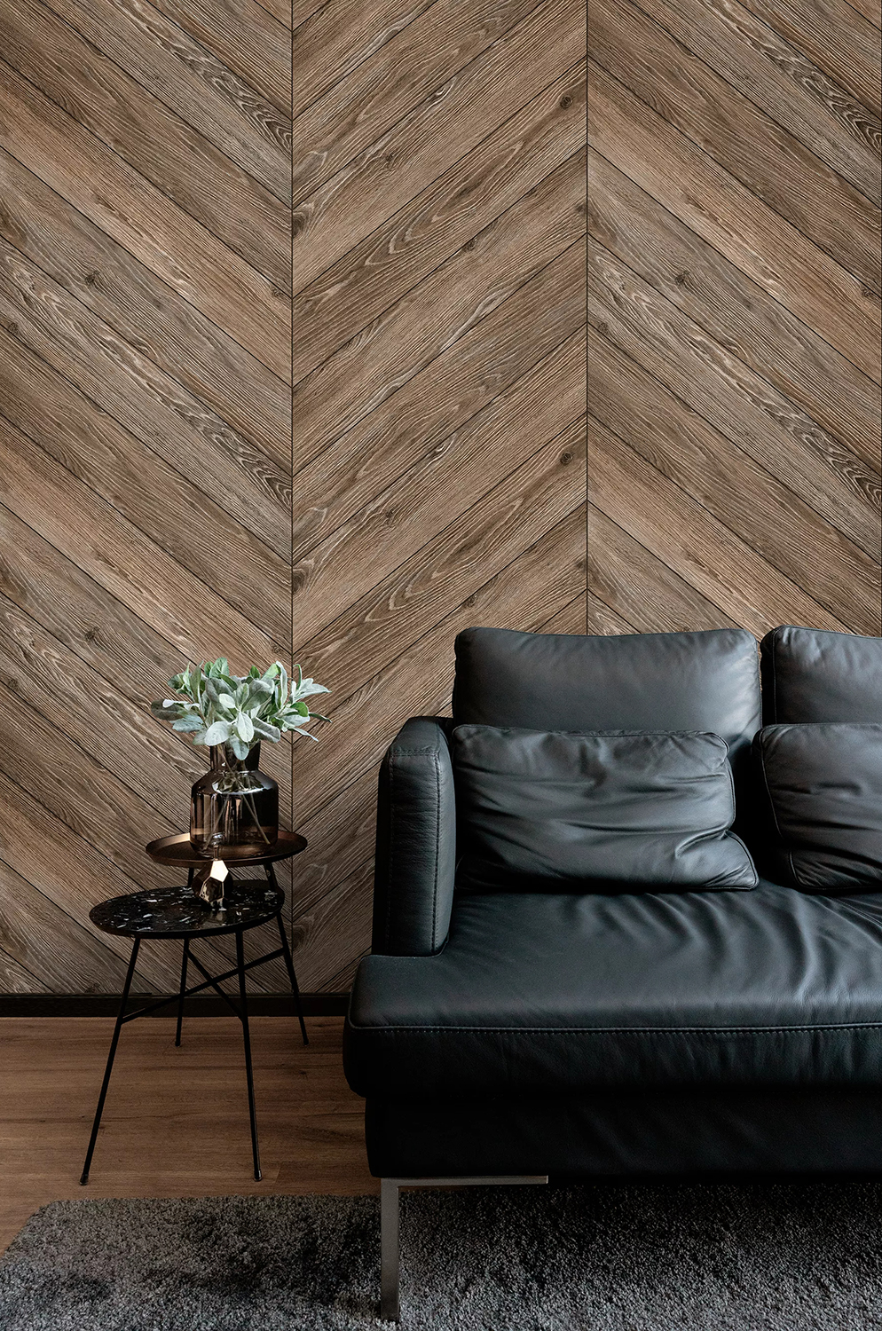 Деревянные доски в натуральных оттенках, паркетный дизайн «ёлочка» – коллекция «Вуд», оригинальное решение для интерьера. Обои с роскошной матовой фактурой дерева – хорошая альтернатива натуральному материалу. Текстура древесины привносит в интерьер уют и тепло, сочетается с различными натуральными фактурами и текстилем.
