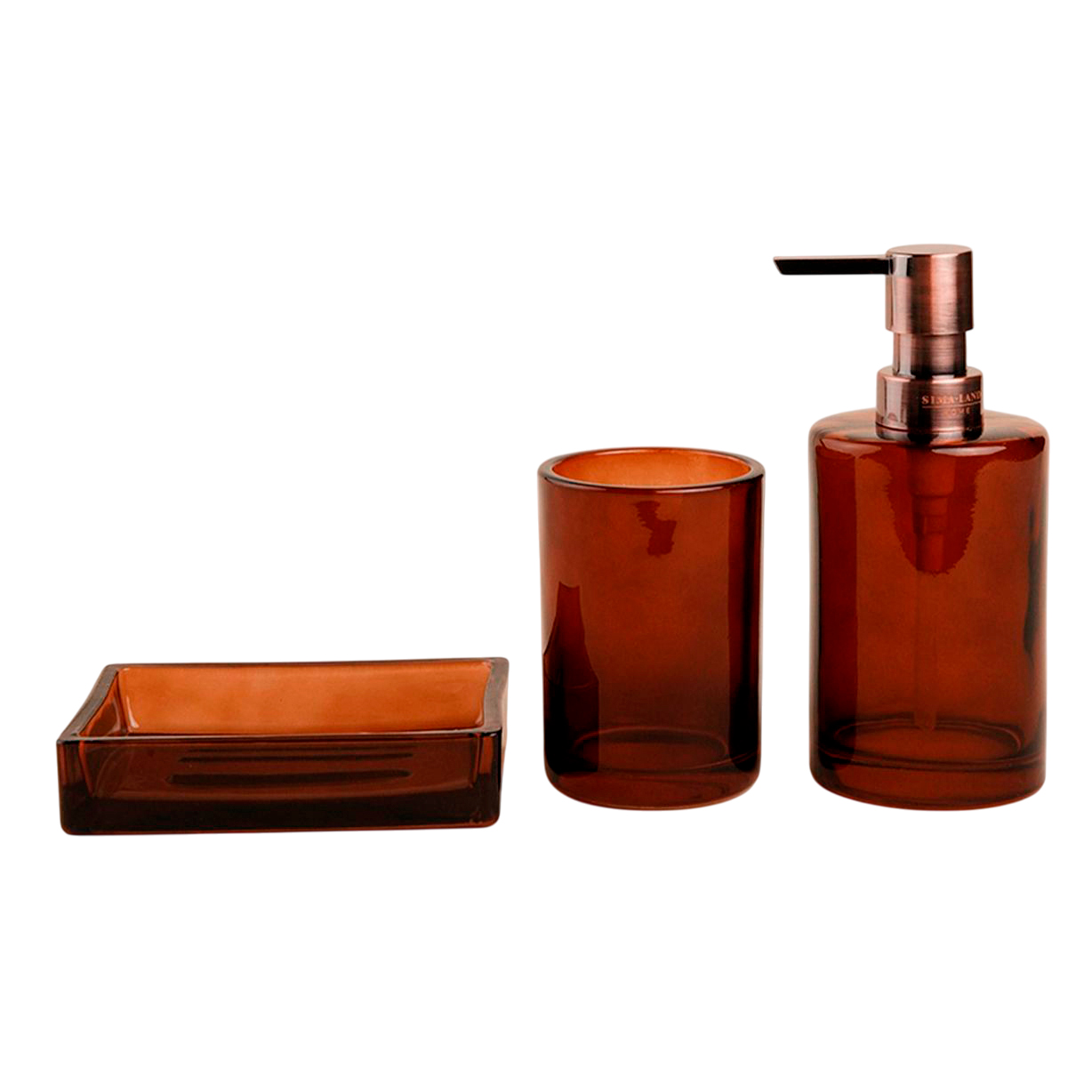Выполненные из высококачественного стекла в утончённых коричневых и прозрачных оттенках, элементы набора подчеркнут изысканность вашего интерьера. Один из главных плюсов — оптимальный объём дозатора в 300 мл, что обеспечивает удобство использования и позволяет долго наслаждаться его функциональностью.