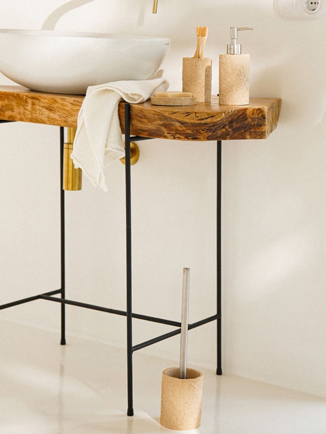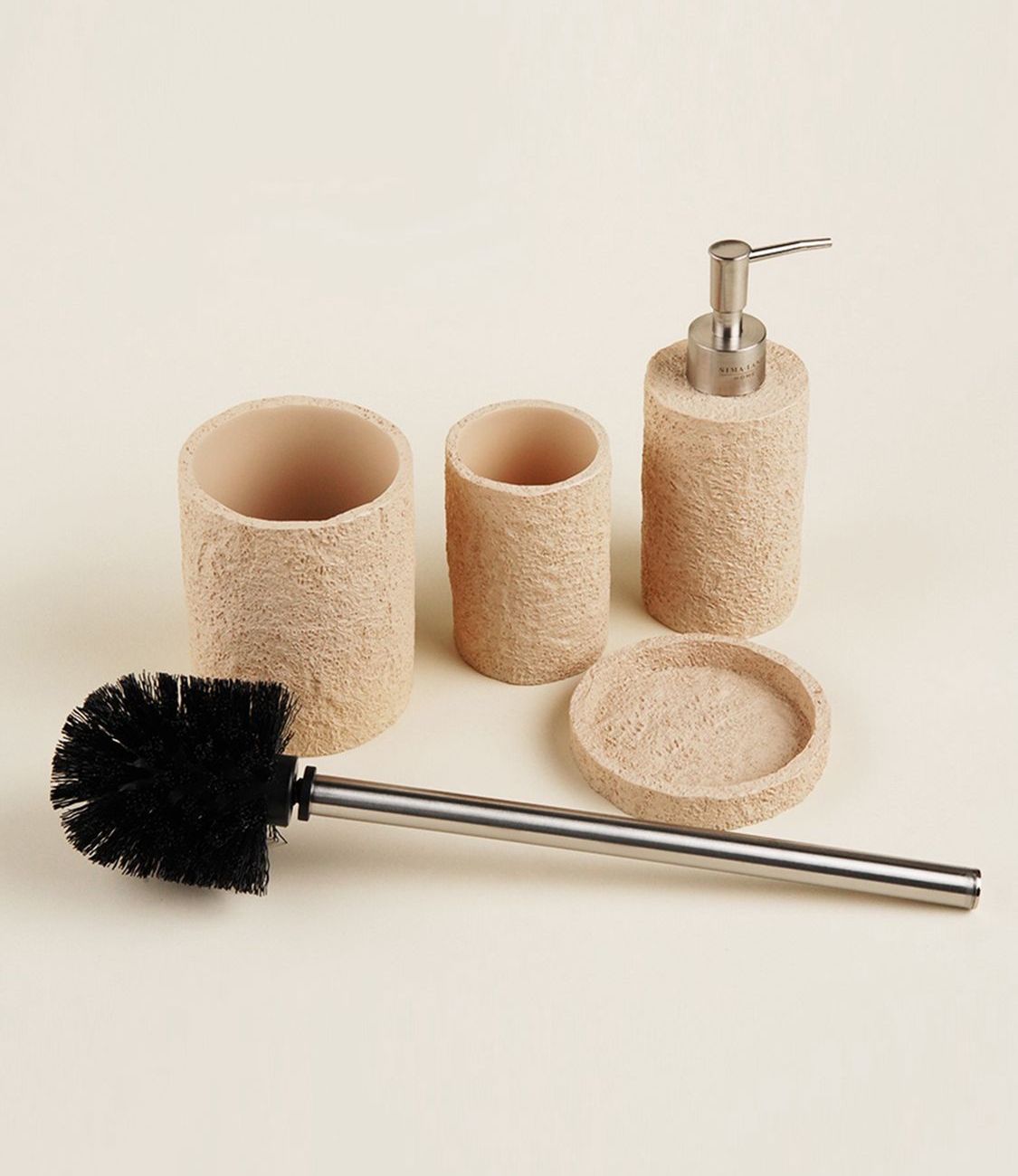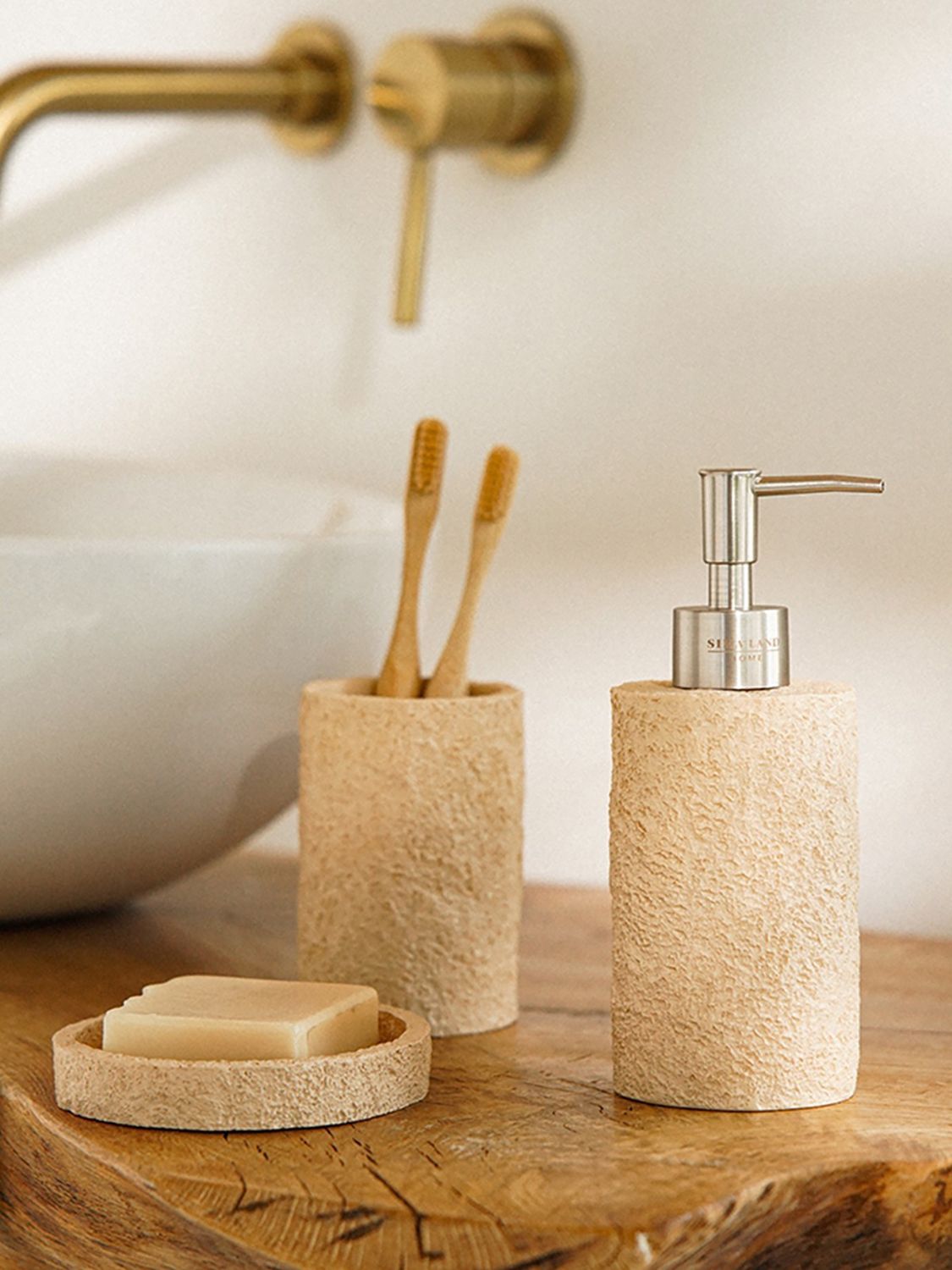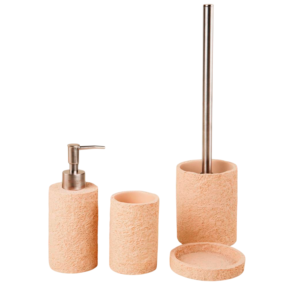 Этот набор аксессуаров для ванной комнаты объединяет в себе все необходимое: дозатор для жидкого мыла, мыльницу, стакан и ёршик. Все изделия выполнены из высококачественного полирезина и пластика. Благодаря сдержанному бежевому цвету и однотонному дизайну, эти аксессуары идеально впишутся в практически любой интерьер ванной комнаты.