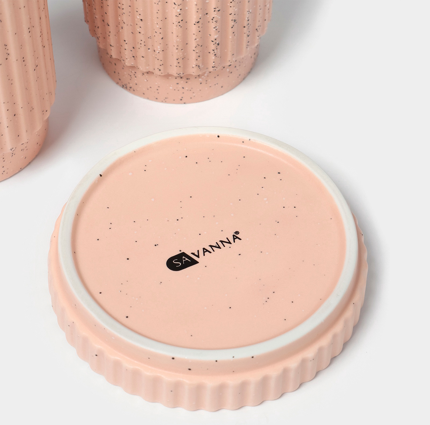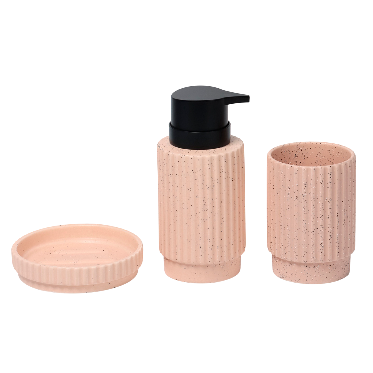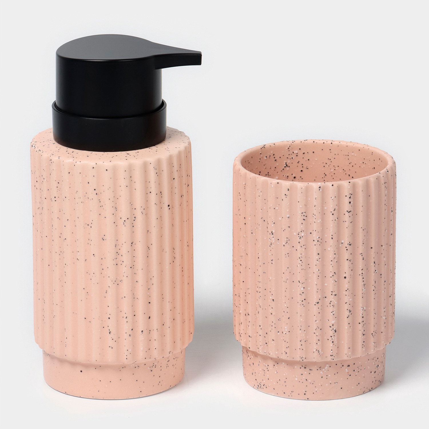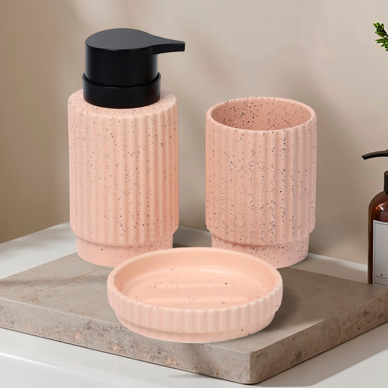 Набор «Крошка» включает дозатор для жидкого мыла, стакан для зубных щёток и мыльницу — базовые аксессуары для комфортного использования.