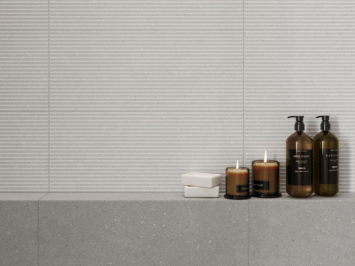 Дополнительный элемент — плита с горизонтальным рельефом. Мелкая, выверенная ритмика позволяет визуально расширить или удлинить стены — всё зависит от способа укладки. Этот элемент добавляет коллекции архитектурности и делает её особенно интересной при проектировании ванных комнат и жилых пространств.
