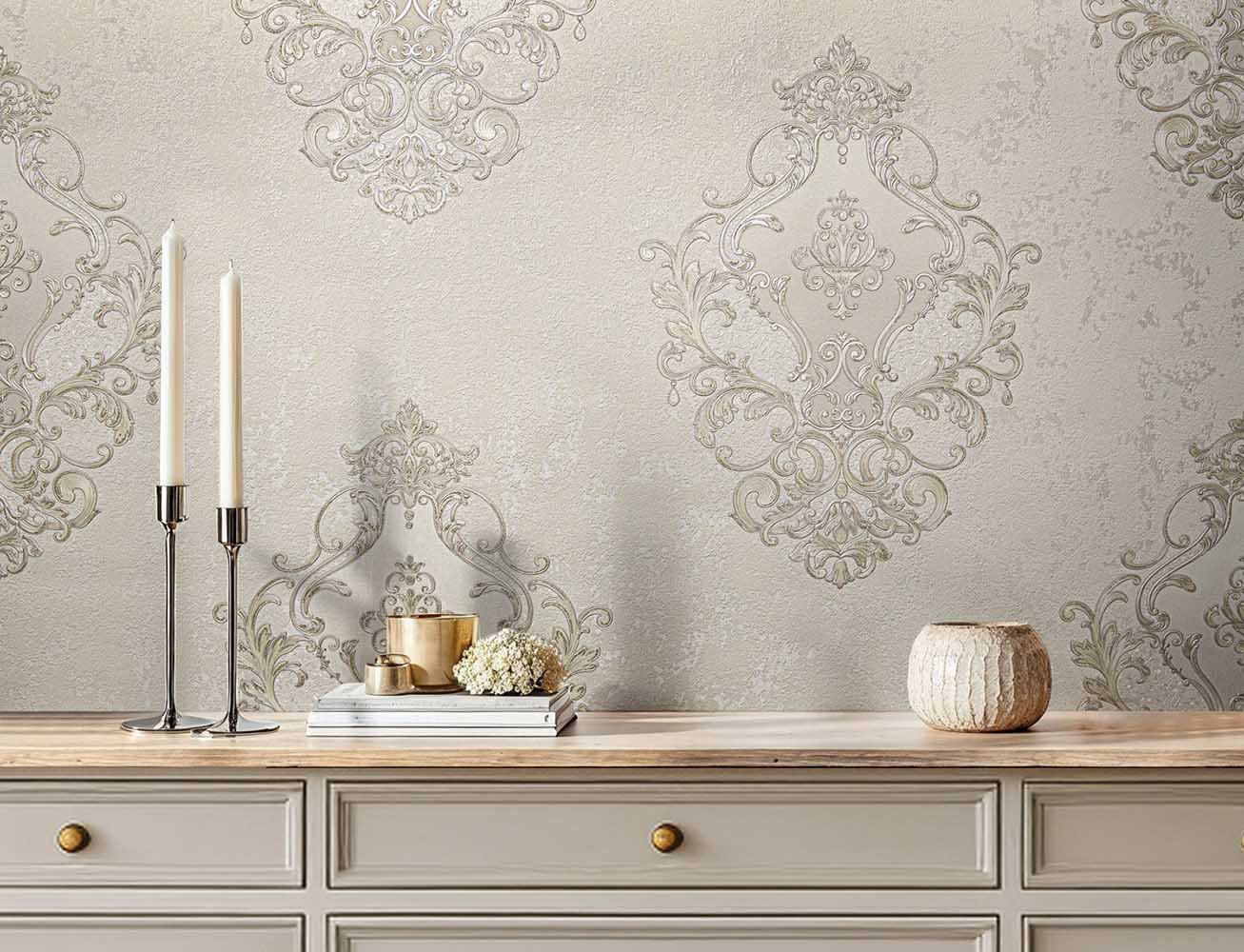 "Giulietta" — венецианское очарование для истинных ценителей классики! Новая коллекция переносит романтику Вероны на ваши стены. Матовые полотна с фактурой штукатурки украшены изысканными дамасскими узорами, которые переливаются золотым и серебряным сиянием. Градиентные переходы, наполняющие благородный орнамент, создают эффект глубины зеркальной поверхности.