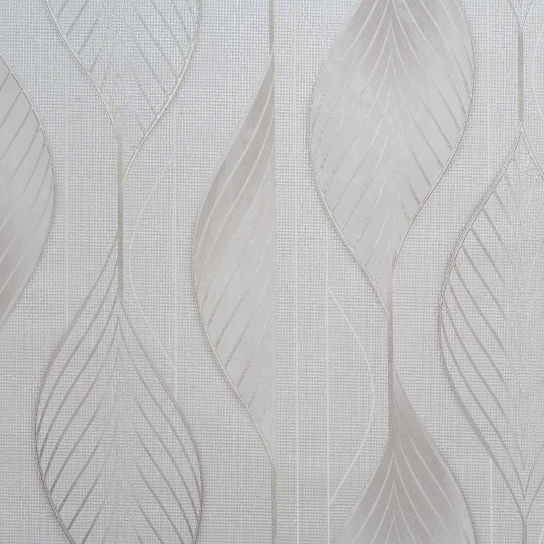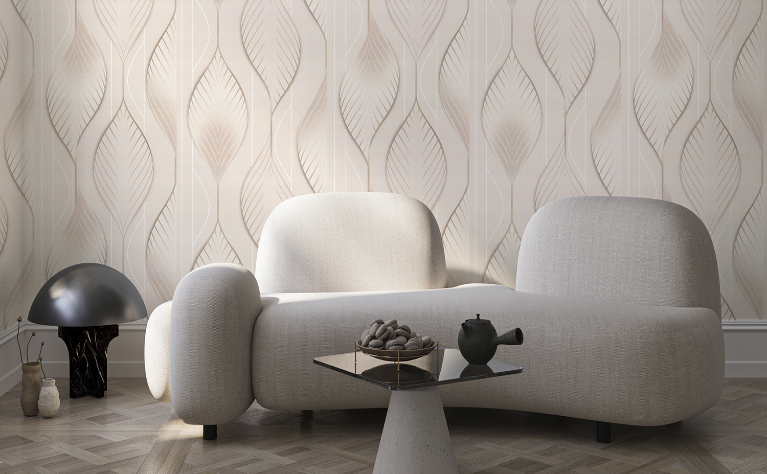 Пространство обоев наполнено воздухом: прозрачные орнаменты переплетены в тройных вертикалях, 3D акценты мягко выстроены через тени и градиентные растяжки, что добавляет глубину без перегруженности.