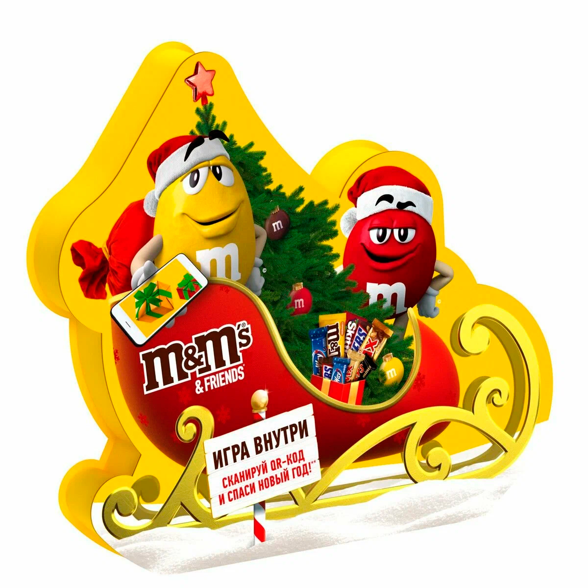 Новогодний набор M&Ms & Friends Сани – способ порадовать близких в наступающий Новый год и Рождество. Сладкий новогодний презент содержит в себе драже M&Ms и Skittles, шоколадные батончик Twix и Milky Way. Новогодняя подарочная упаковка в виде праздничных саней, веселые герои M&Ms, любимые сладости – отличное дополнение к праздничному столу и прекрасный презент для ребенка.