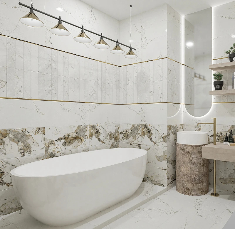 Интерьер с кварцитом Патагония выглядит дорого и необычно. Патагония – это смелое заявление в любом дизайне и роскошь, которая отражает высокий статус и вкус владельца. Коллекция Patagonia выполнена в формате 315х630 мм, в глянцевой глазури. Базовые плиты состоят из 6-ти лиц каждая. Декоративная база, имитирующая модную нынче структуру «briks», выполнена с люстром и микрорельефом, что делает плиту эффектной, особенно в лучах направленного света. Коллекцию прекрасно дополнят в выкладке металлические хромированные бордюры золотого или серебряного цвета. А также дерево Palladio, которое позволит естественно зонировать пространство в эко стиле.
