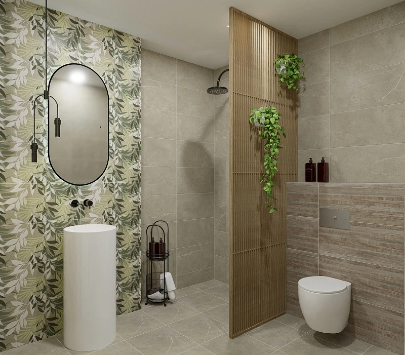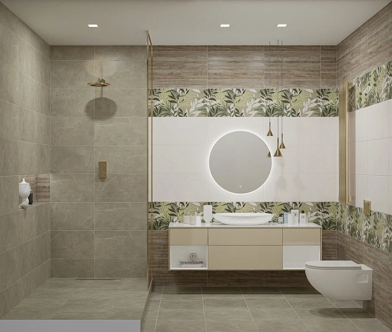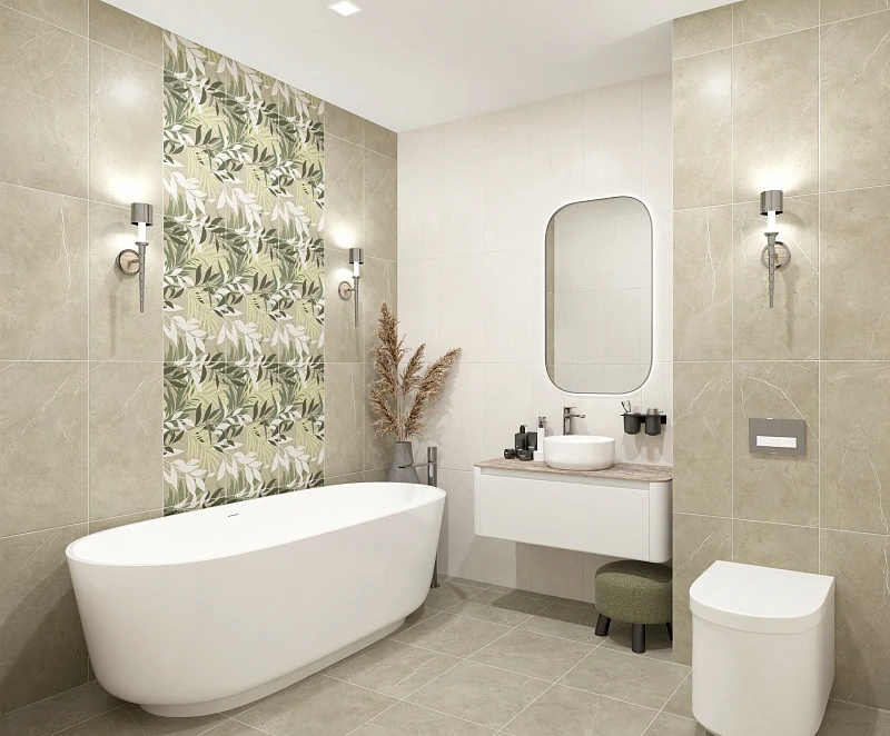 Настоящим украшением коллекции является декоративная база. Нежные зеленые оттенки листвы, дополненные узором из сахарной гранильи, создают игру света и тени, и задают характер всему интерьеру. Возможность использования данной плиты широки: она отлично будет смотреться и как отдельный декоративный элемент и как акцентная стена.