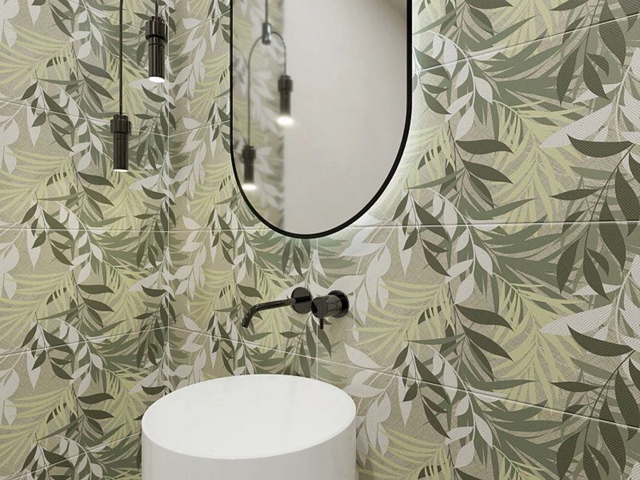 Настоящим украшением коллекции является декоративная база. Нежные зеленые оттенки листвы, дополненные узором из сахарной гранильи, создают игру света и тени, и задают характер всему интерьеру. Возможность использования данной плиты широки: она отлично будет смотреться и как отдельный декоративный элемент и как акцентная стена.