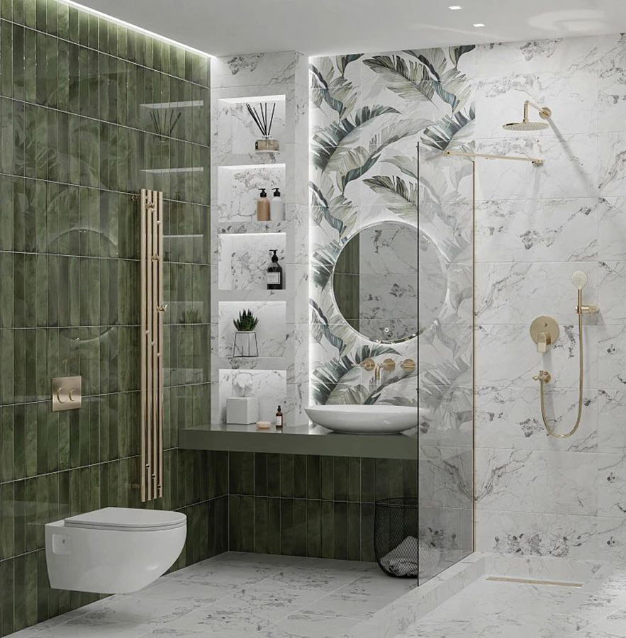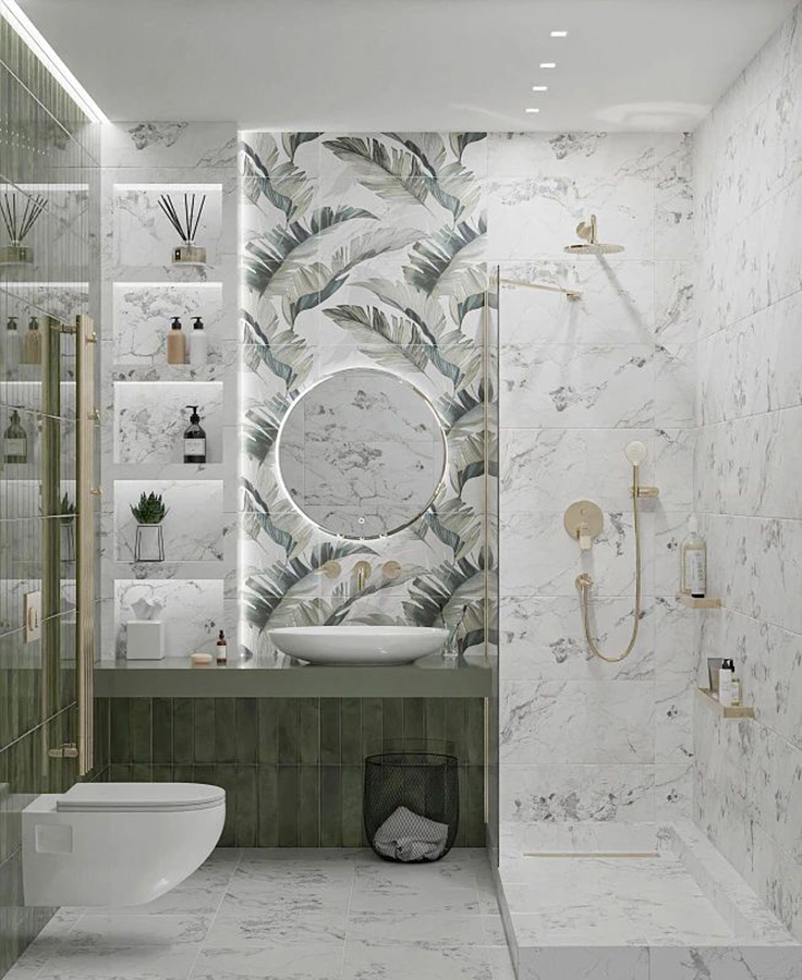 Белизна светлой плиты с легкими вкраплениям и серебристых жил и камней. Крупные "дымчатые" прожилки на чистом белом фоне идеально подчеркивают особенности плитки с помощью эффектного хроматического цвета.
