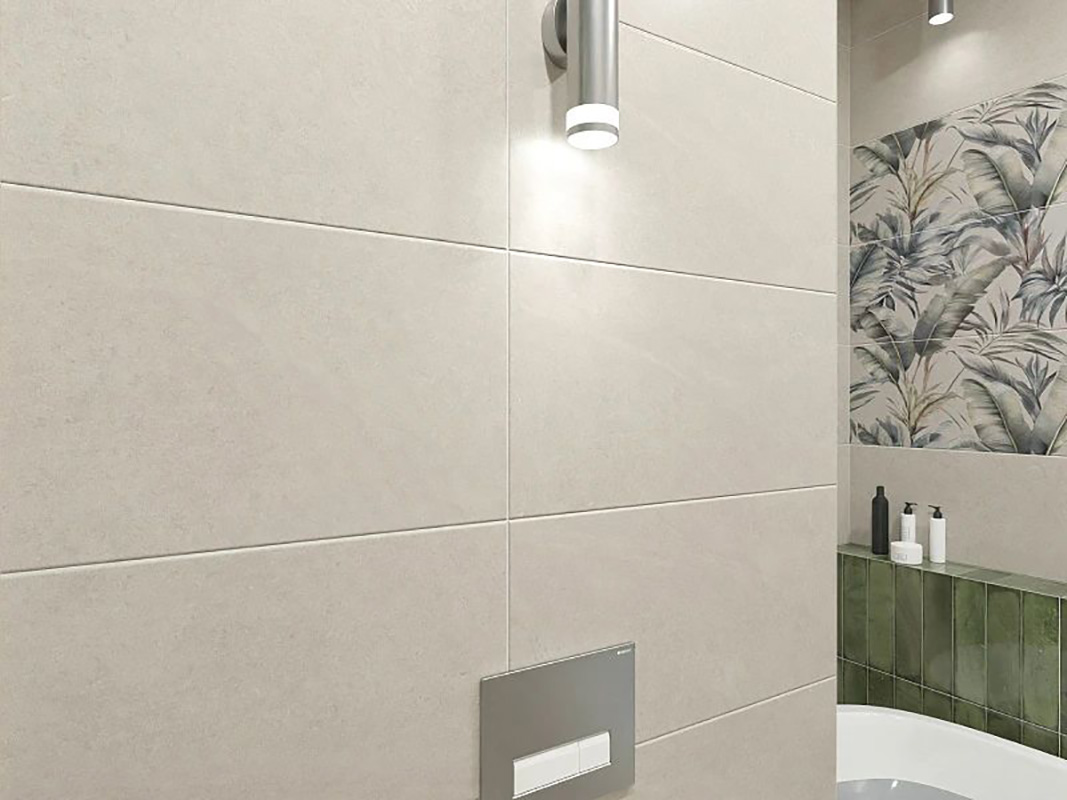 Декоративные плитки имеют флористические мотивы: две плитки стыкуются между собой шахматном порядке, образуя композицию из акварельно прорисованных листьев папоротника и банана. Мотив выполнен в пастельной технике, что добавляет легкости коллекции. это отсылка к ботаническим иллюстрациям и тенденции к биофильному дизайну.
