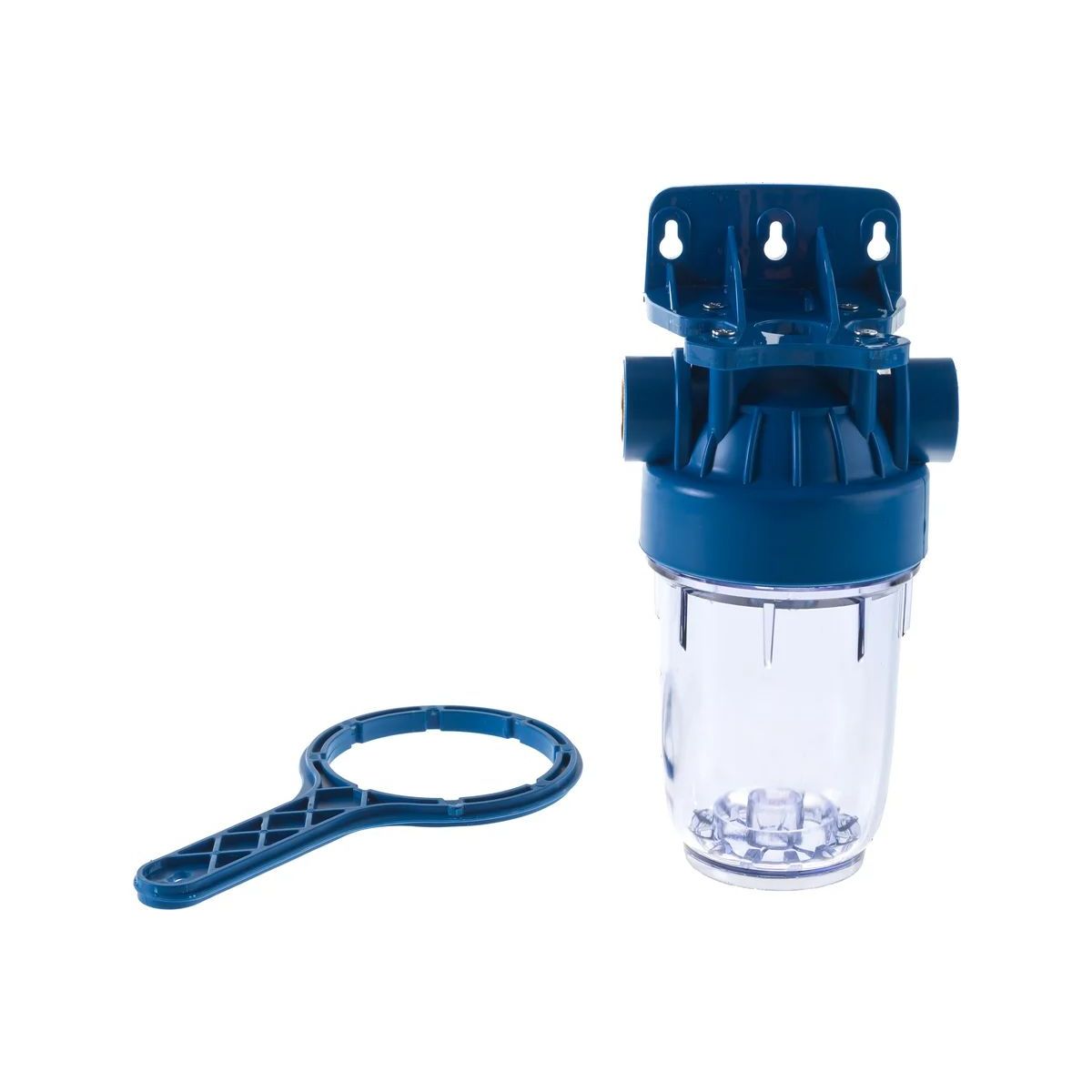 Магистральный корпус (5 Slim Line) с клапаном сброса давления, уплотнительным кольцом и прозрачной колбой, резьба 1/2". Укомплектован монтажным кронштейном с саморезами, ключом. Прозрачный корпус дает возможность оценить степень загрязнения картриджа, а воздушный клапан позволяет выпустить скопившийся после замены картриджа воздух, а также сбросить избыточное давление перед разборкой.