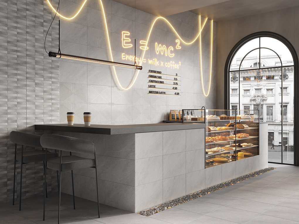В качестве декора используется плита такого же формата с современным геометрическим орнаментом. Особенно полно он раскрывается в ковре, когда стыкуясь друг с другом на плитках вырисовываются крупные, играющие на свету серебристо-перламутровые ромбы. Акцентная плитка коллекции имеет рельеф из крупных разнонаправленных прямоугольников с объемными выступающими вершинами.
