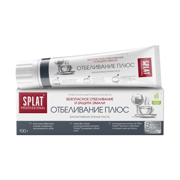 Зубная паста SPLAT Professional «Отбеливание Плюс» (WHITE PLUS) со фтором ухаживает за зубами и безопасно отбеливает их благодаря уникальному чистящему комплексу Sp.White System. Натуральный фермент папаин и высокомолекулярный отбеливающий компонент полидон эффективно расщепляют налет, способствуют сохранению белизны. Ионы калия снижают повышенную чувствительность зубов. Фторид-ионы эффективно защищают от кариеса.