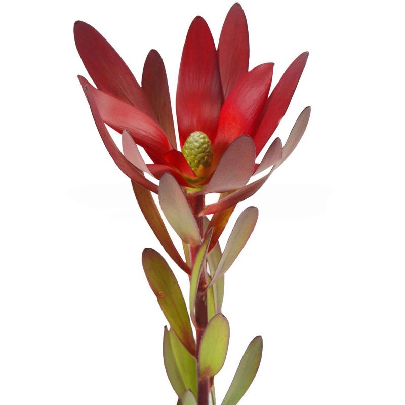 Леукадендрон – экзотическое растение семейства протейных растение родом из Южной Америки. В род левкадендронов включено более 100 видов кустарников и деревьев. Стебли прочные, одиночные или разветвлённые. На верхушках располагаются крупные, яркие, плотно собранные соцветия. Часто расположенные зелёные листья овальные, коротко заострённые, покрыты восковым налётом и густыми шелковистыми волосками, которые создают дополнительный декоративный эффект мягко серебрящейся поверхности.