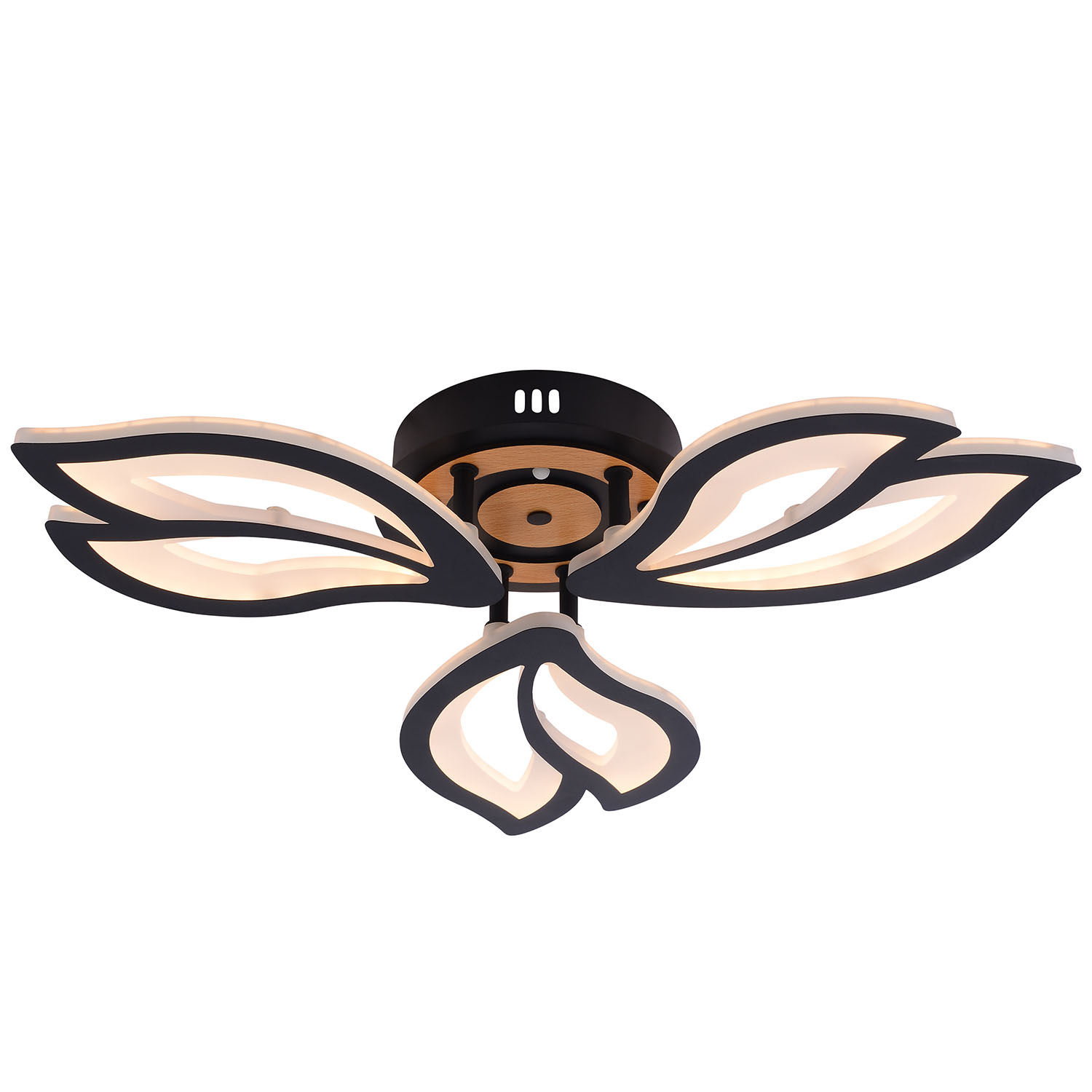 Серия черных светодиодных потолочных светильников с элементами натурального дерева включает модели мощностью 60 и 100 Вт. В комплекте пульт ДУ для удобного регулирования яркости и цветовой температуры от 3000 до 6250 К, позволяя настроить освещение под любые потребности и атмосферу.