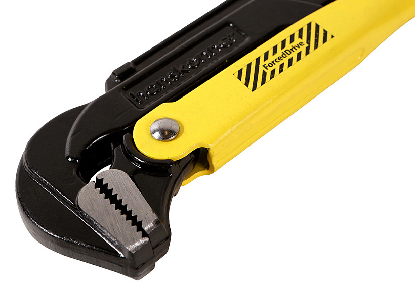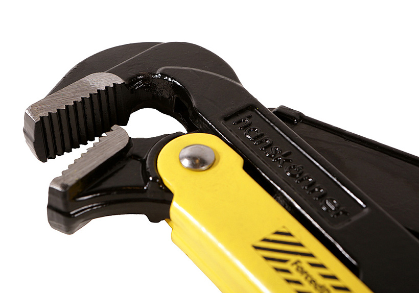 Конструкция ключа относится к типу L с углом расположения губок 90°, что обеспечивает оптимальное распределение усилия при работе и удобный доступ к соединениям в ограниченном пространстве. Рычажный механизм создает мощное усилие сжатия на губках: чем сильнее усилие прикладывается к рукоятке, тем плотнее захватывается деталь, предотвращая проскальзывание.