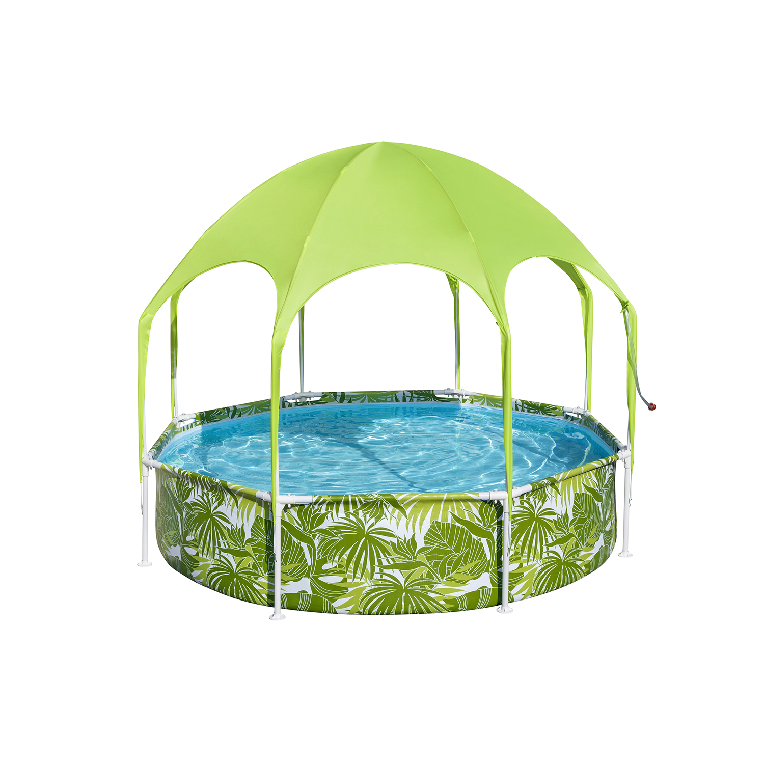 Удобный сливной клапан позволяет присоединить садовый шланг, что дает возможность слить воду в любое место. Навес от солнца изготовлен из из материала соответствующего стандарту защиты от ультрафиолета UPF40t.