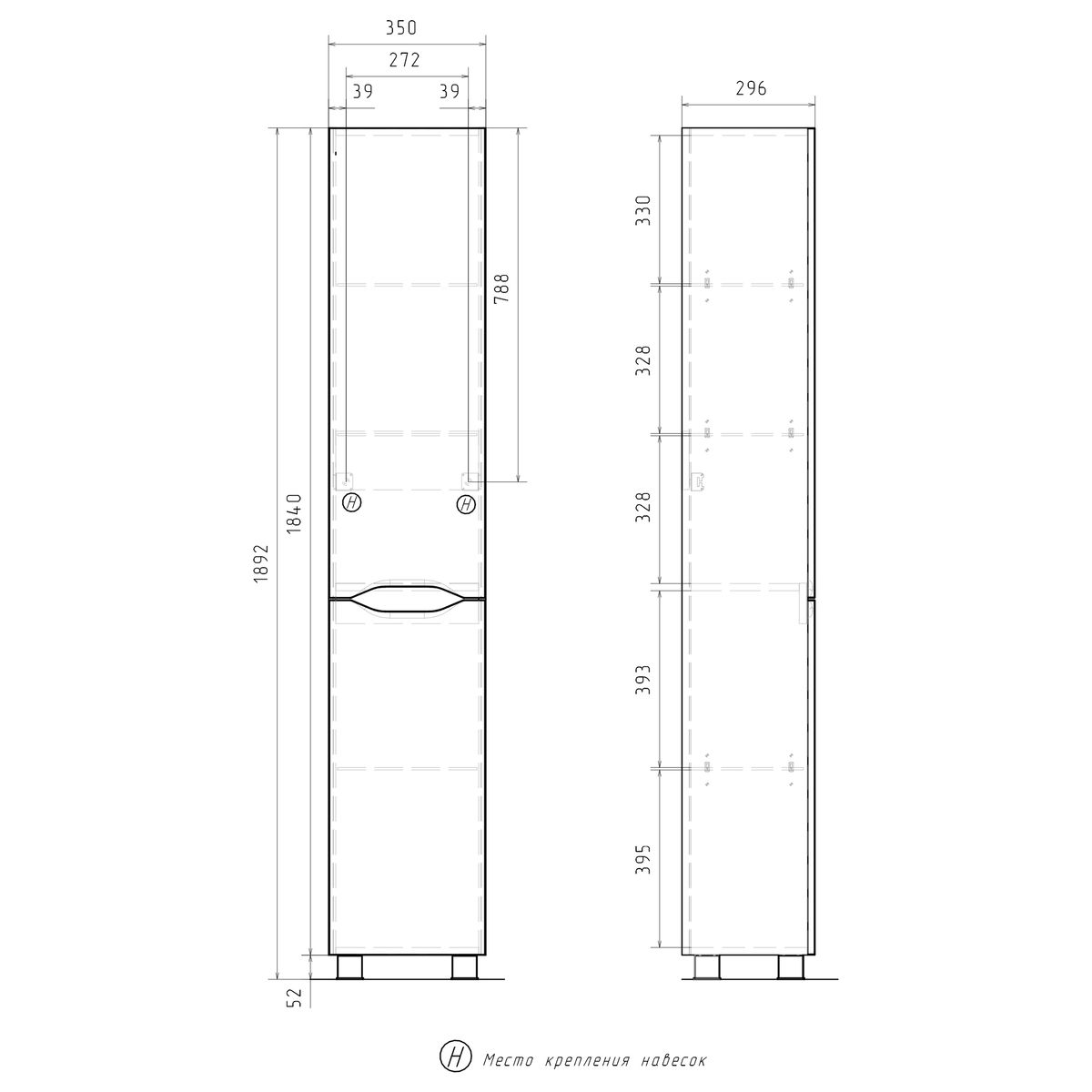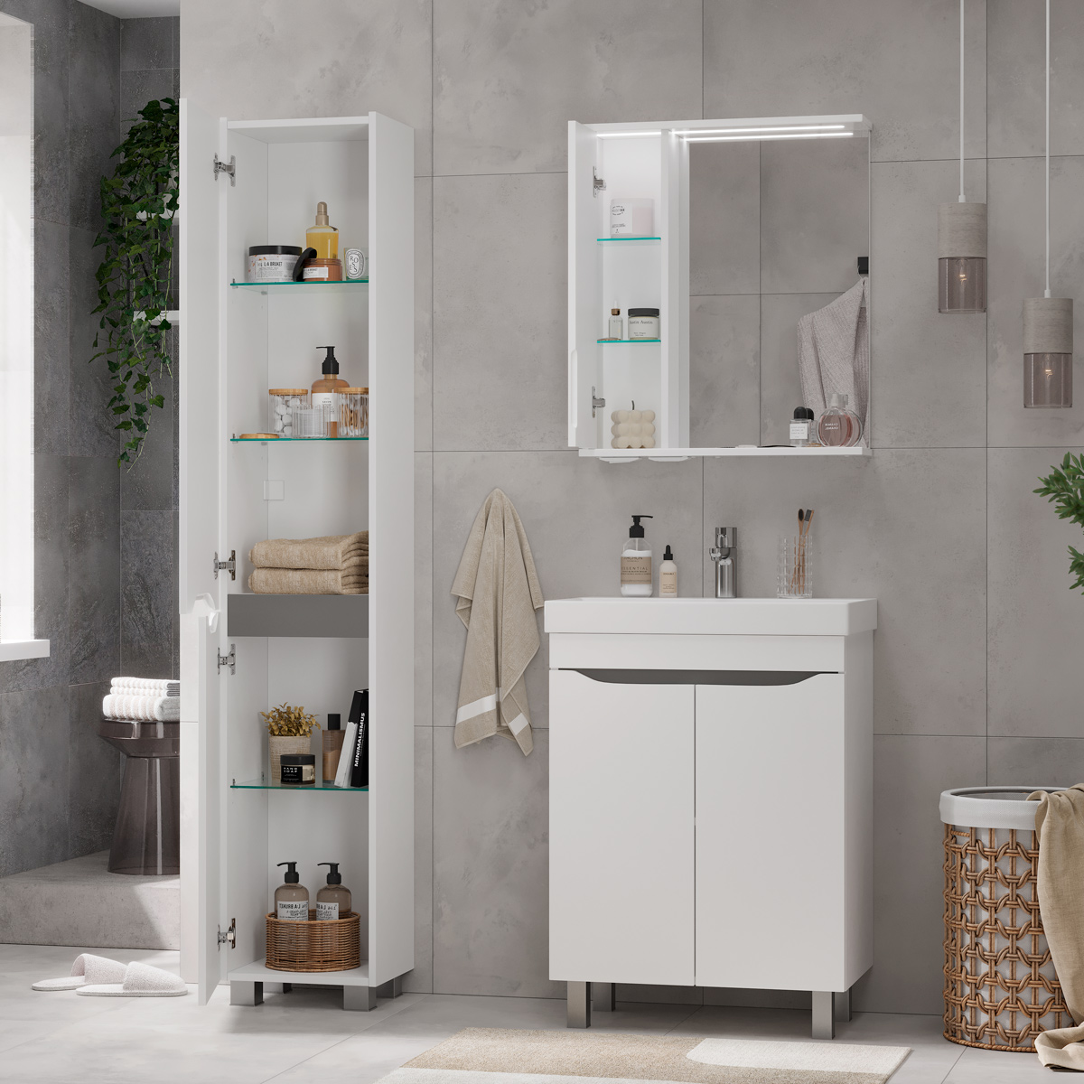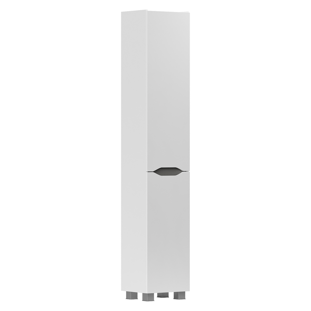 Напольный пенал с двумя стеклянными полками в верхней секции и одной стеклянной полкой в нижней секции. Фасады пенала изготовлены из МДФ и облицованы глянцевой пленкой ПВХ. Корпус тумбы сделан из влагостойкого ЛДСП. Дверцы пенала открываются при помощи интегрированных ручек. Петли на дверцах с доводчиками для плавного и бесшумного закрывания. Пенал устанавливается на четыре регулируемые опоры и фиксируется к стене при помощи креплений.