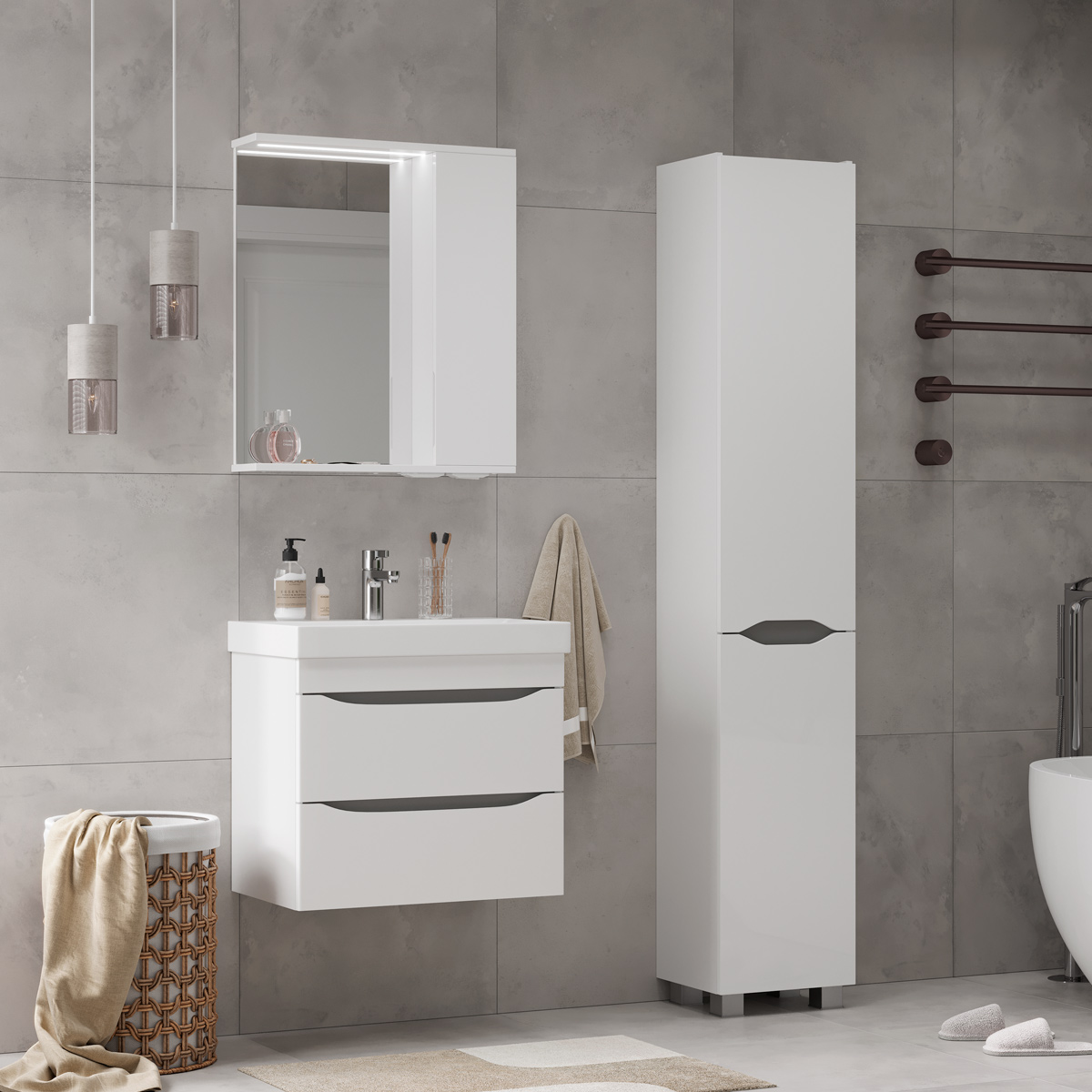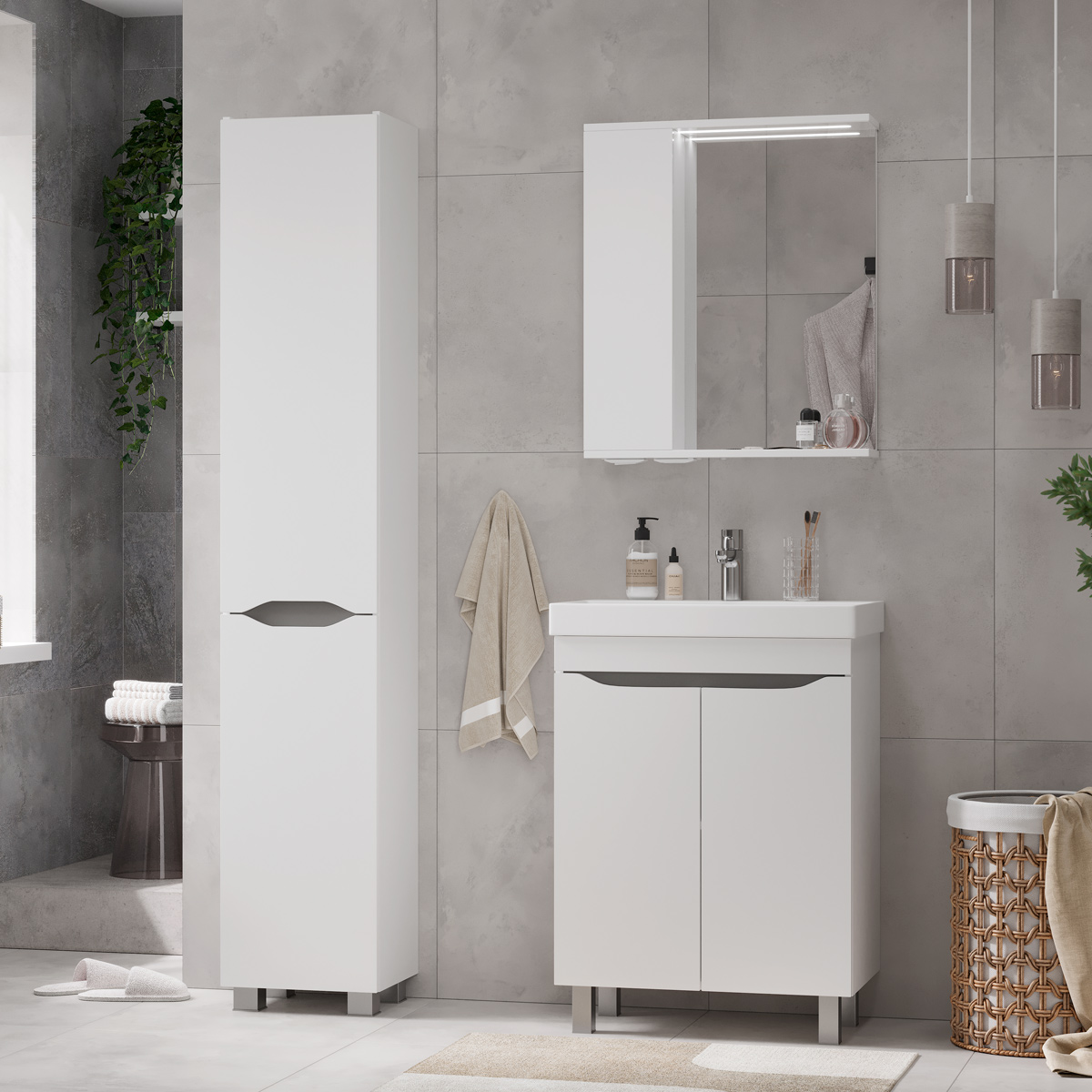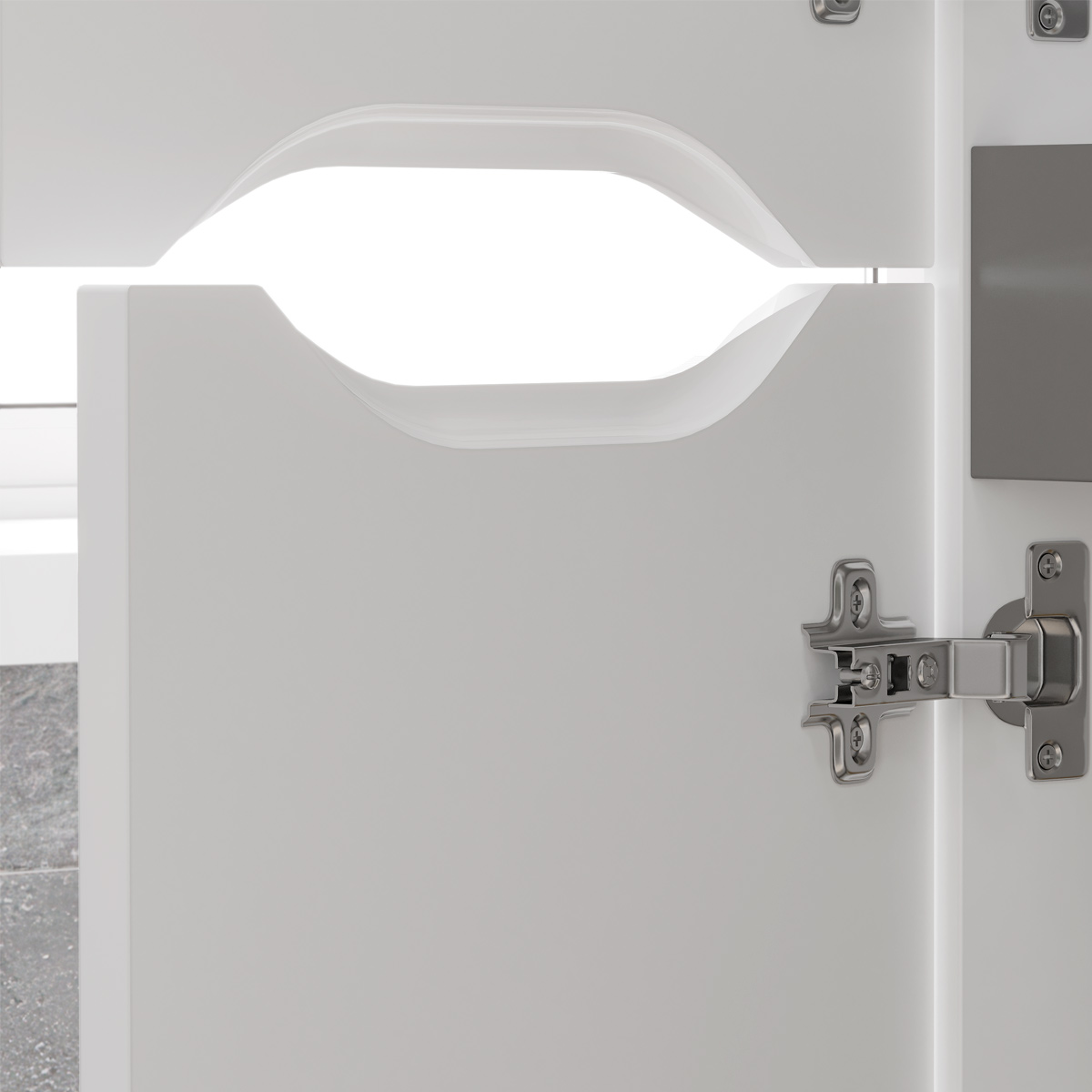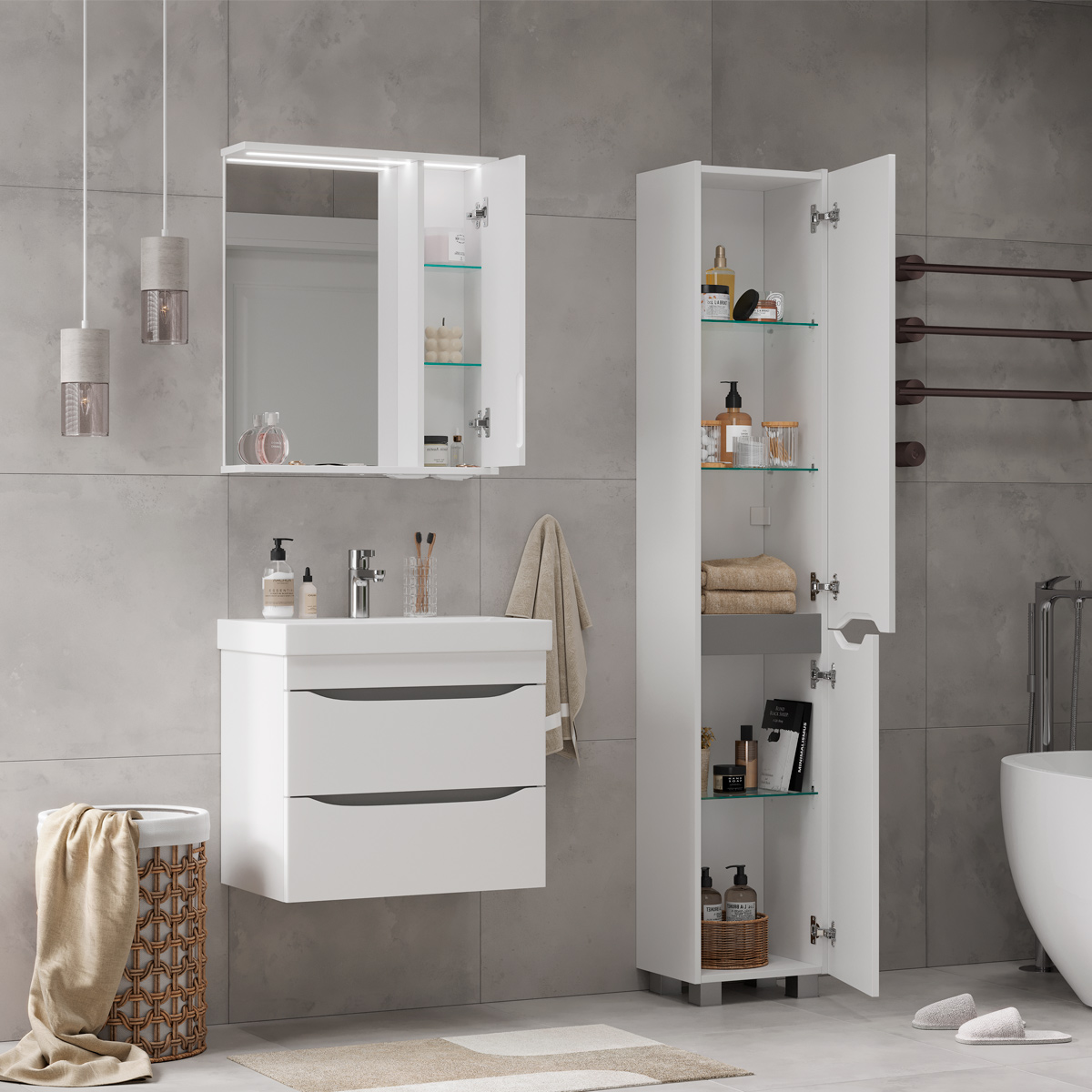 Напольный пенал с двумя стеклянными полками в верхней секции и одной стеклянной полкой в нижней секции. Фасады пенала изготовлены из МДФ и облицованы глянцевой пленкой ПВХ. Корпус тумбы сделан из влагостойкого ЛДСП. Дверцы пенала открываются при помощи интегрированных ручек. Петли на дверцах с доводчиками для плавного и бесшумного закрывания. Пенал устанавливается на четыре регулируемые опоры и фиксируется к стене при помощи креплений.