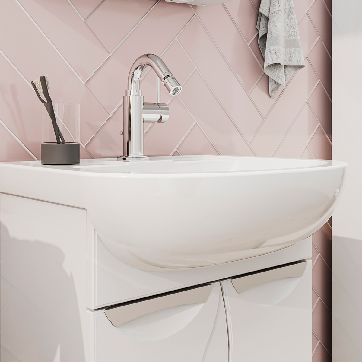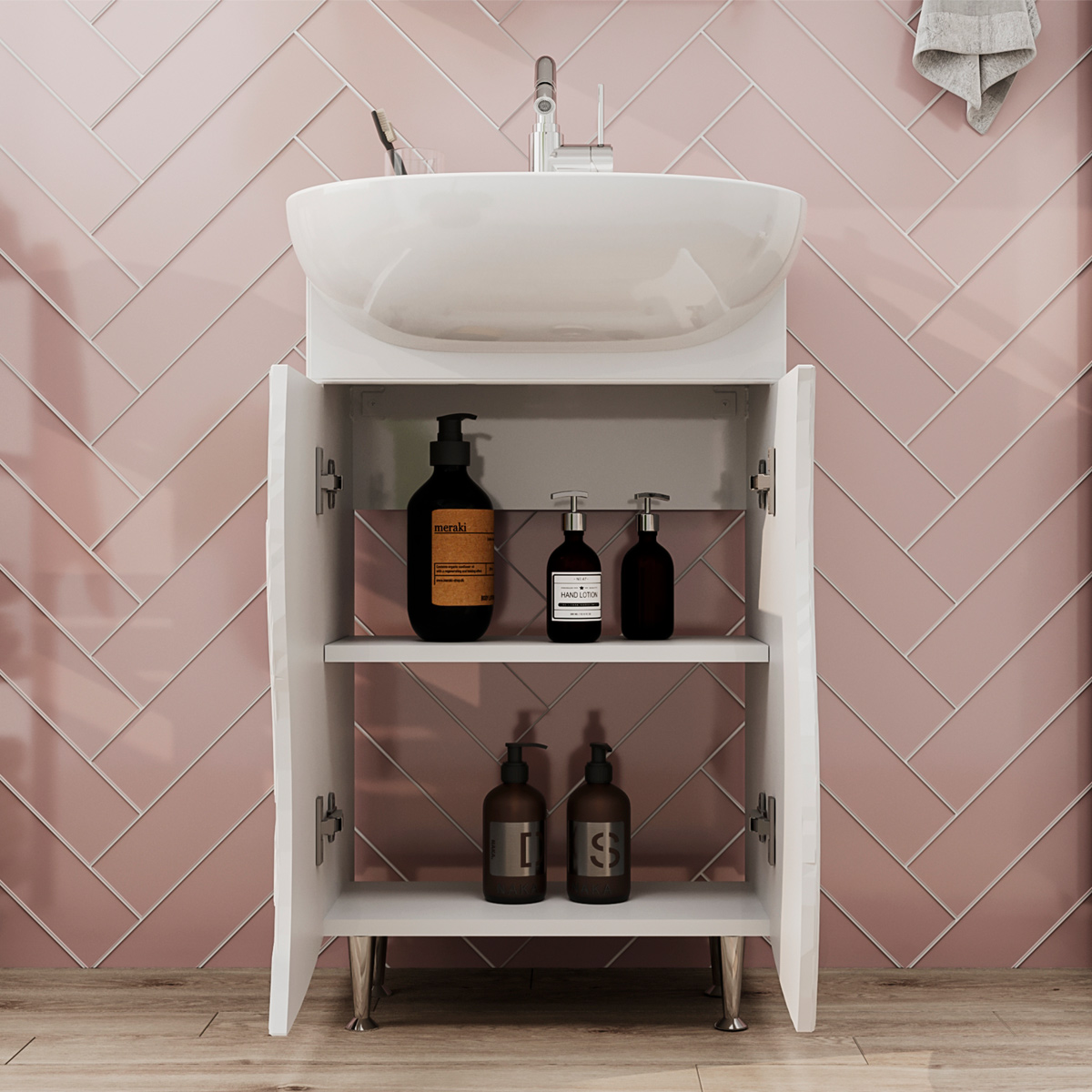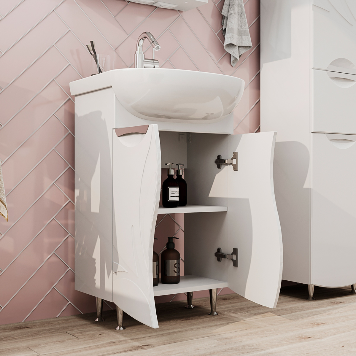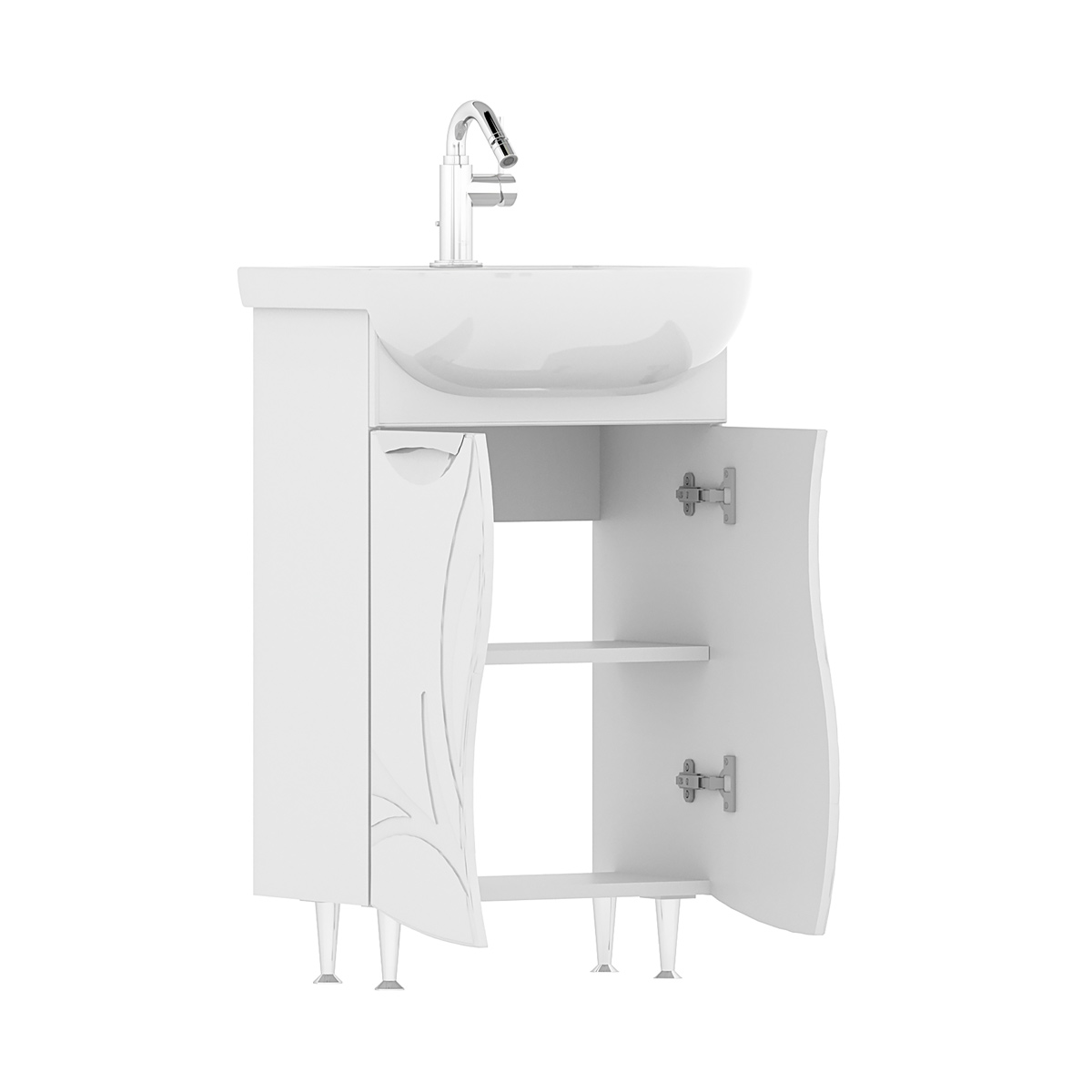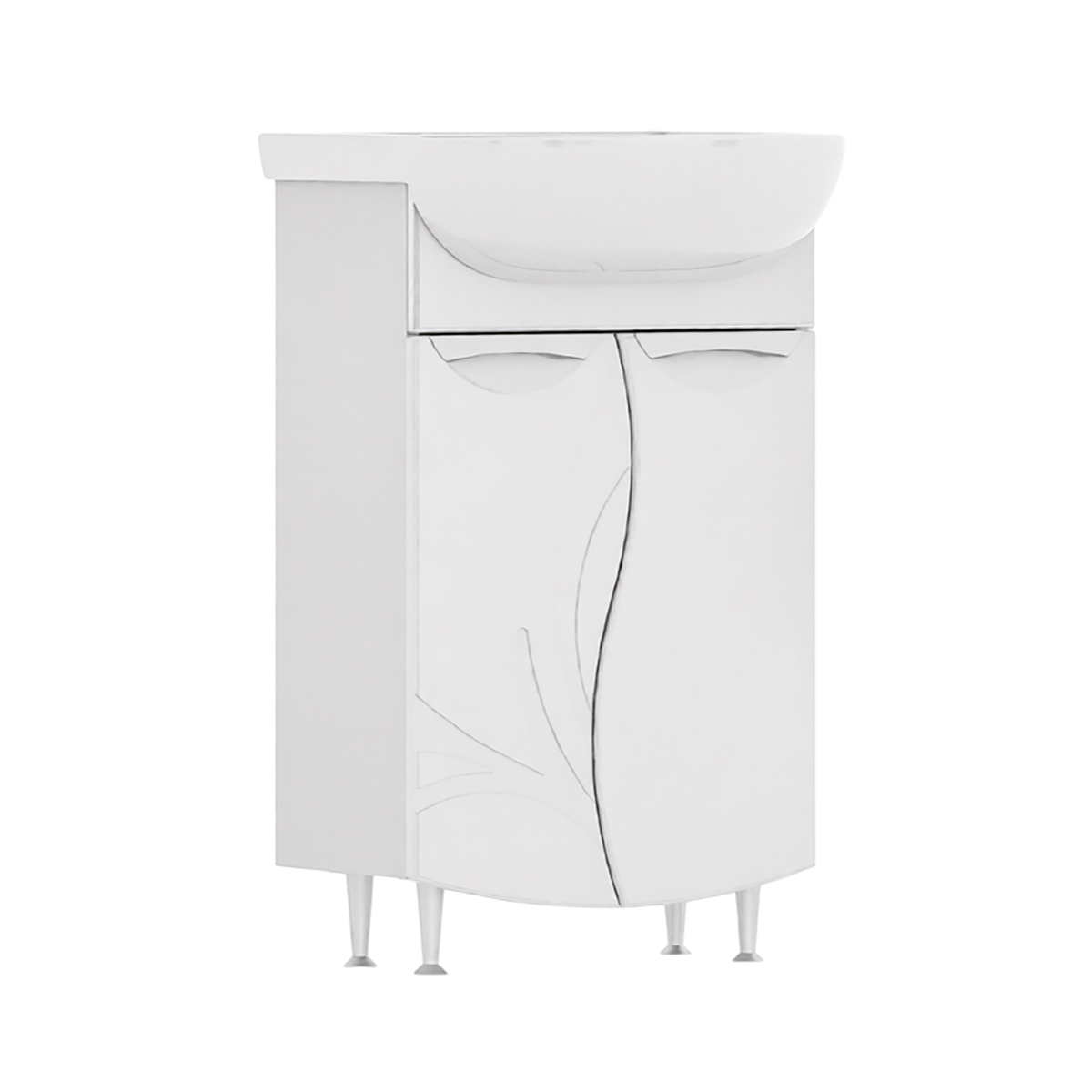 Напольная тумба с двумя распашными дверцами. Для хранения внутри предусмотрена полка из ЛДСП. Петли на дверце оснащены доводчиками. Фасады тумбы с декоративной фрезеровкой изготовлены из МДФ и облицованы глянцевой пленкой ПВХ. Корпус тумбы сделан из влагостойкого ЛДСП. Лицевая фурнитура в цвете хром. Тумба устанавливается на четыре регулируемые опоры и фиксируется к стене при помощи креплений.