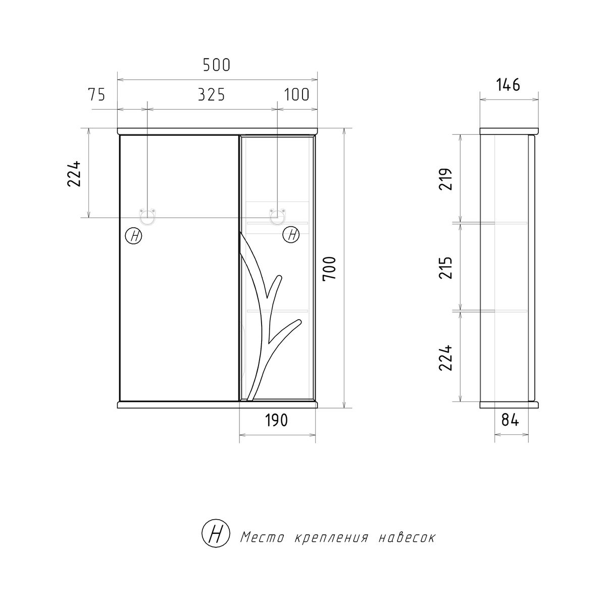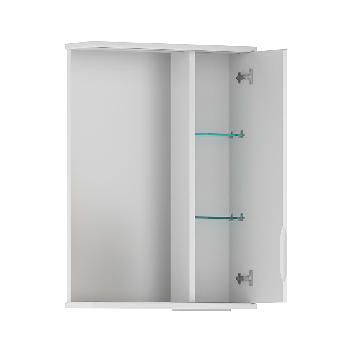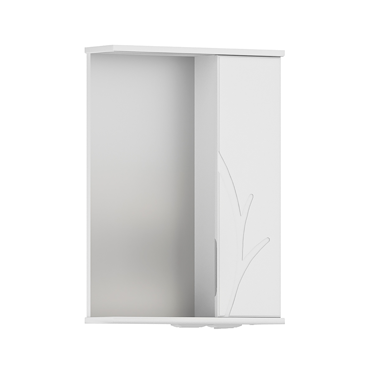 Зеркало-шкаф с двумя стеклянными полками за распашной дверцей. Петли на дверце оснащены доводчиками для плавного и бесшумного закрывания. Фасад с декоративной фрезеровкой, крышка и основание зеркального шкафа изготовлены из МДФ и облицованы глянцевой пленкой ПВХ. Корпус зеркального шкафа сделан из влагостойкого ЛДСП.