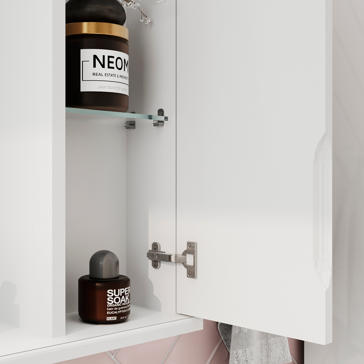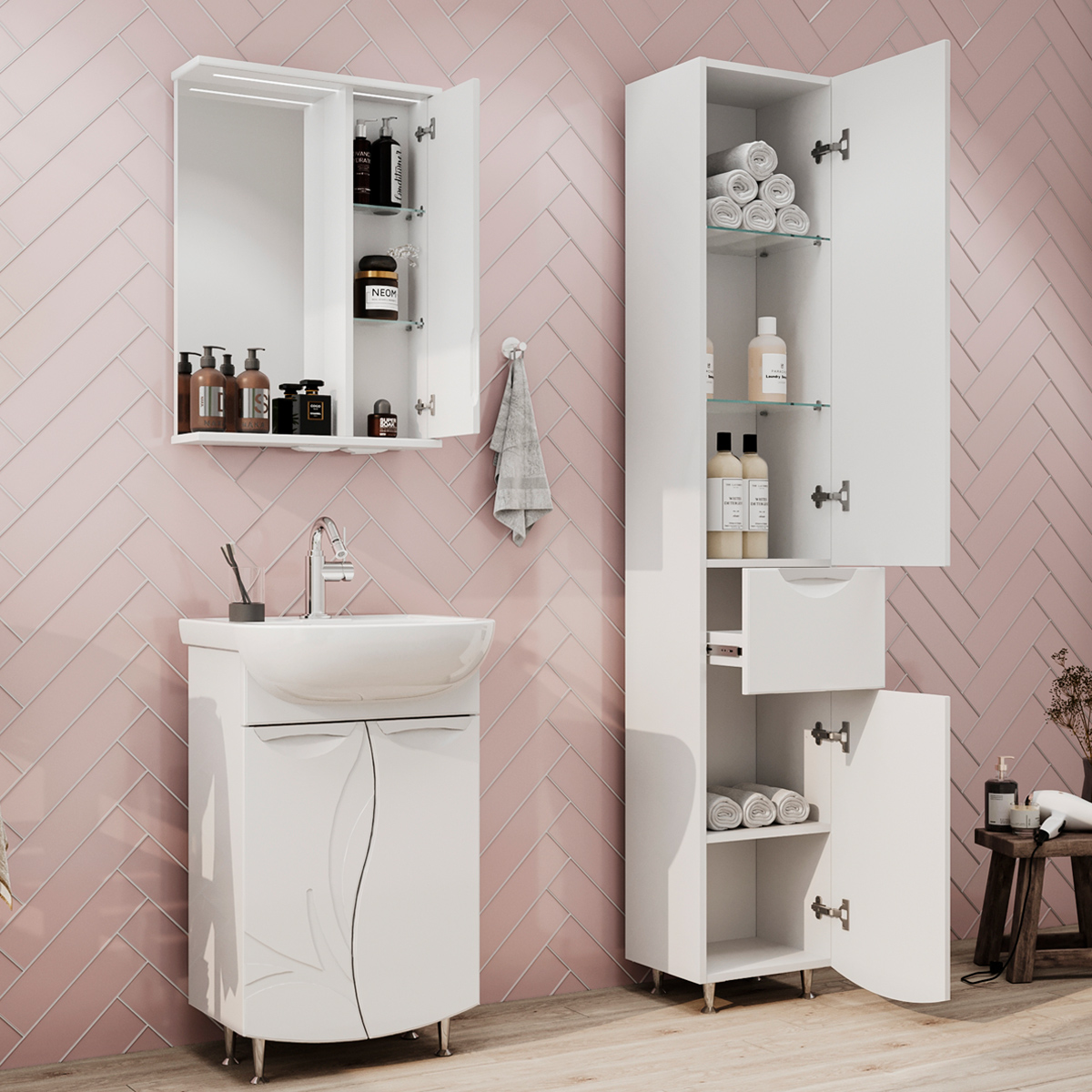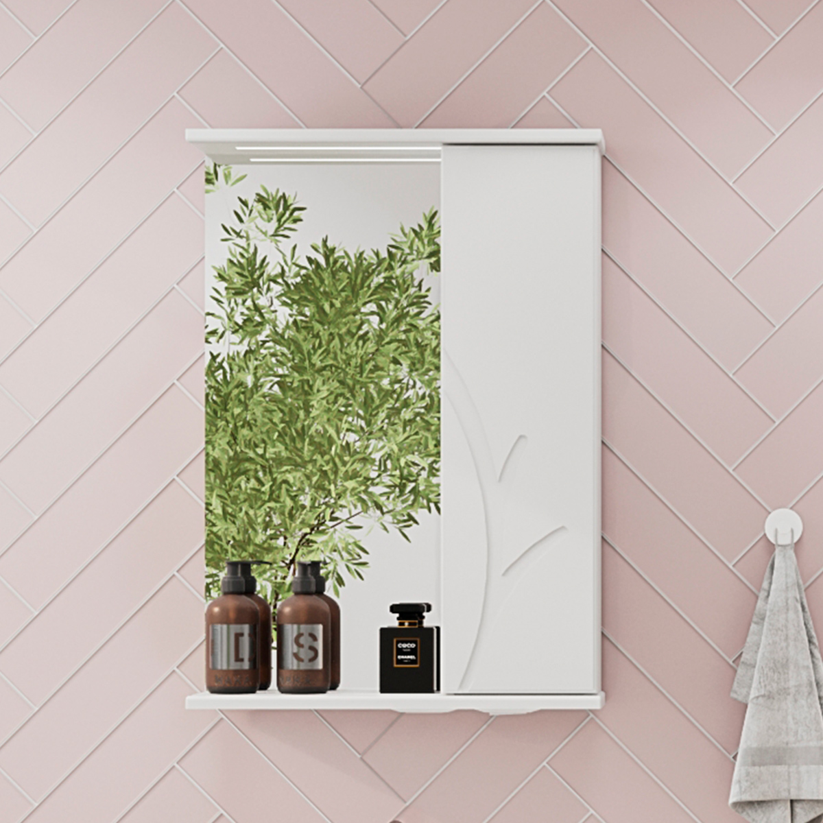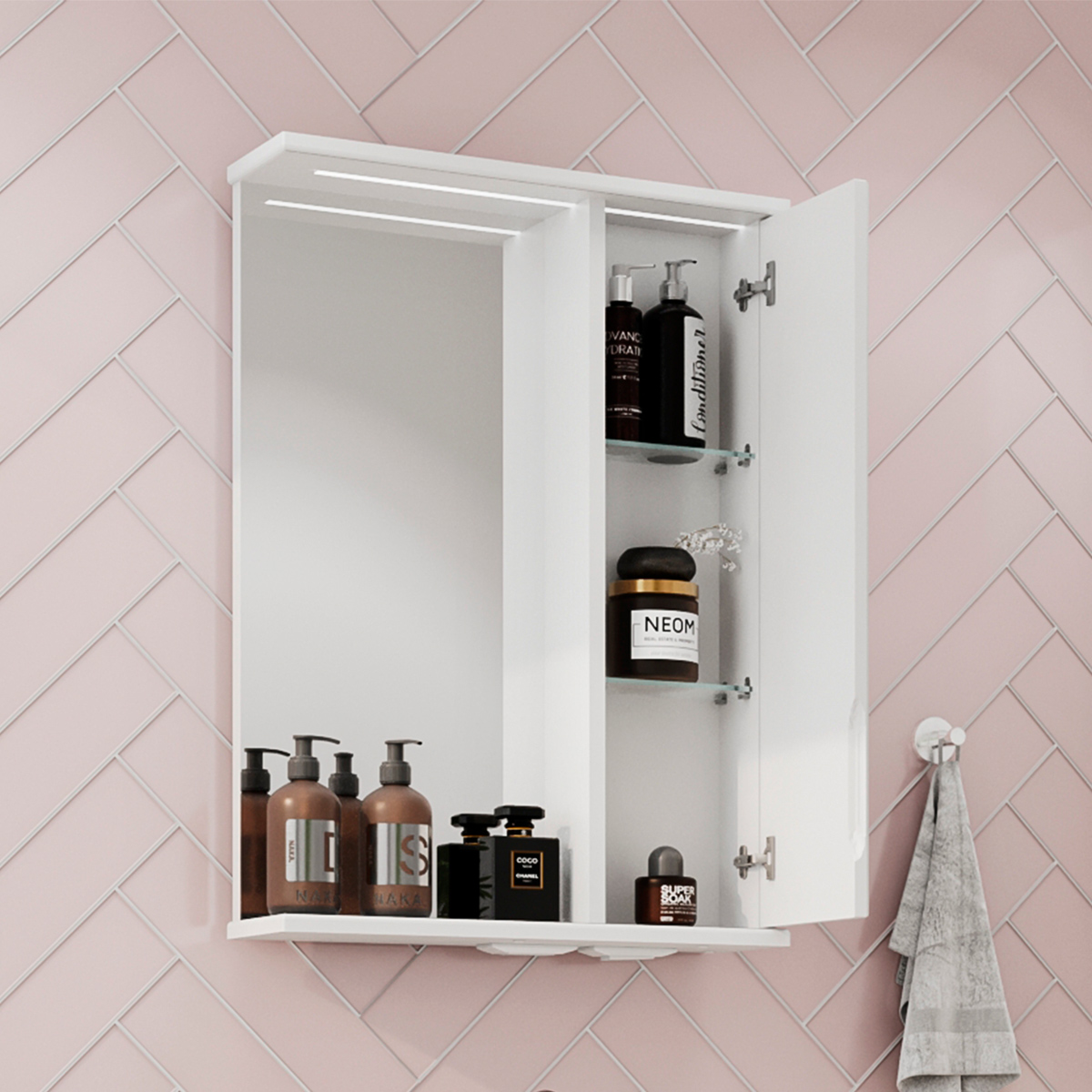 Зеркало-шкаф оснащено встроенной светодиодной подсветкой, электрической розеткой и выключателем. Шкафчик открывается при помощи интегрированной ручки.