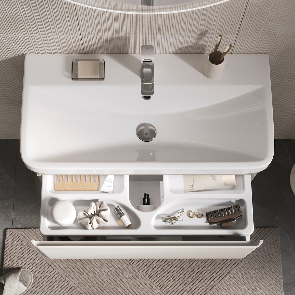 Подвесная тумба в цвете Амарок/Белый с одним внешним выдвижным ящиком и встроенным выдвижным органайзером для оптимизации хранения из МДФ. Ящик открывается за счет специальной отфрезерованной интегрированной ручки. Направляющие скрытого монтажа внешнего ящика оснащены доводчиками для плавного закрывания. Фасад и корпус тумбы изготовлены из МДФ и облицованы матовой пленкой ПВХ с эффектом "Soft Touch".