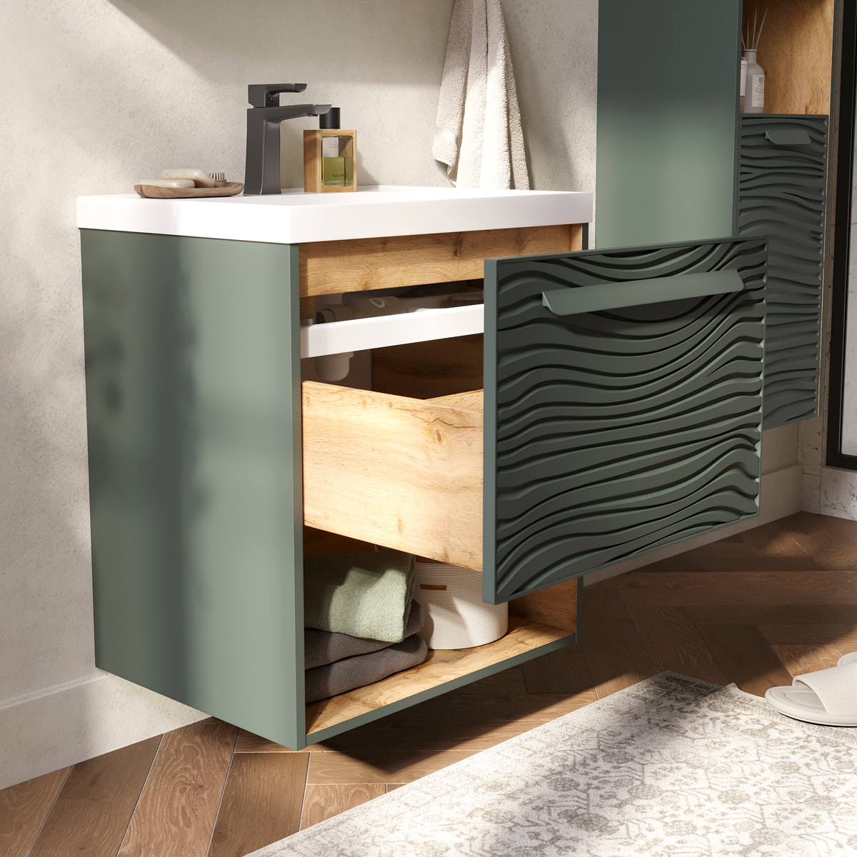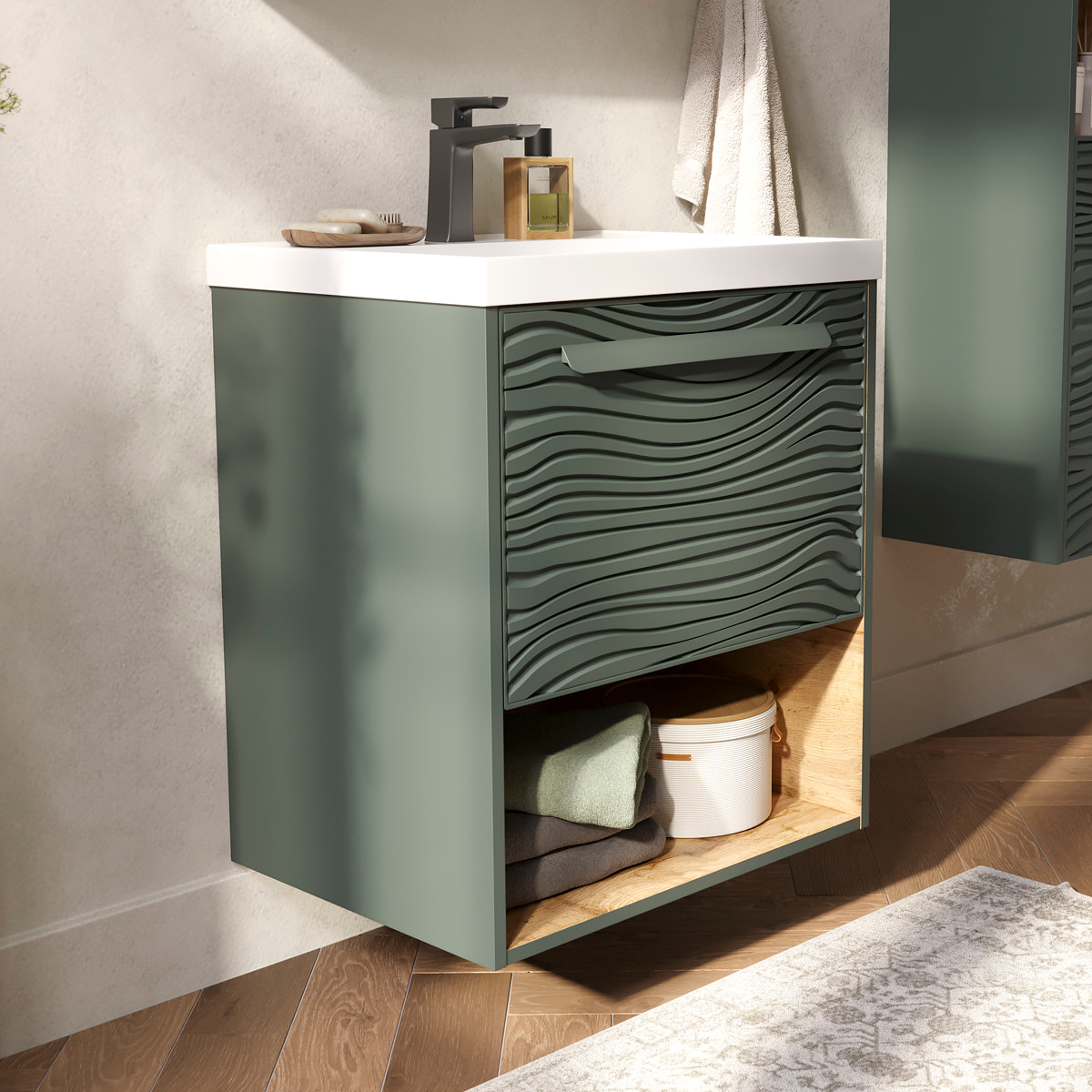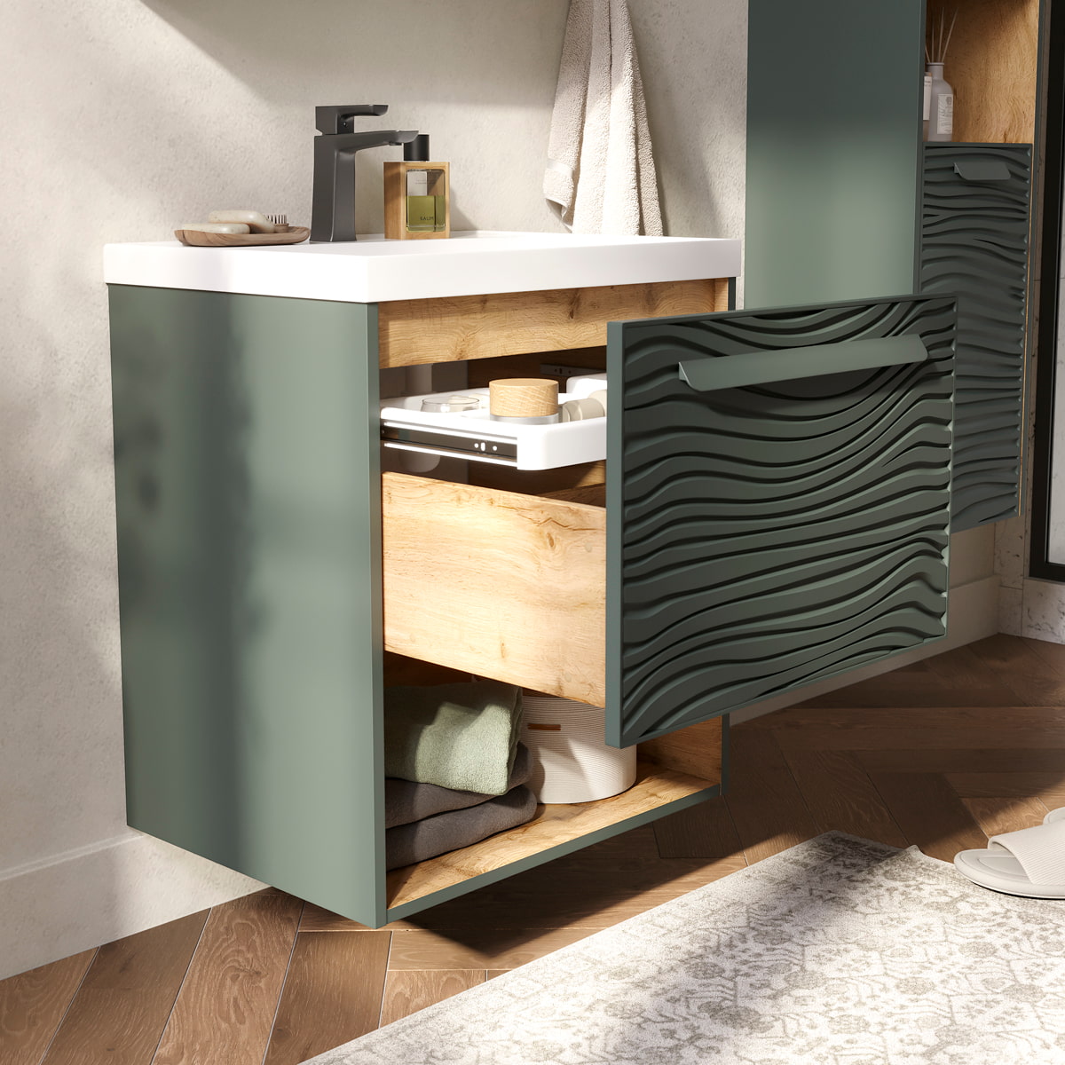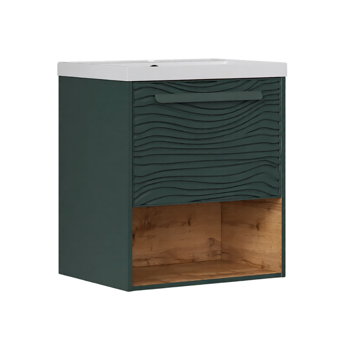 Подвесная тумба в цвете Зеленый камень/дуб вотан с открытой нишей, одним внешним выдвижным ящиком и встроенным выдвижным органайзером для оптимизации хранения из МДФ. Ящик открывается при помощи металлической ручки, окрашенной в цвет фасада. Направляющие скрытого монтажа внешнего ящика оснащены доводчиками для плавного закрывания. Фасад с декоративной фрезеровкой и корпус тумбы изготовлены из МДФ и облицованы матовой пленкой ПВХ с эффектом "Soft Touch". Комплектуется раковиной Prime 60, поставляется в комплекте с сифоном.