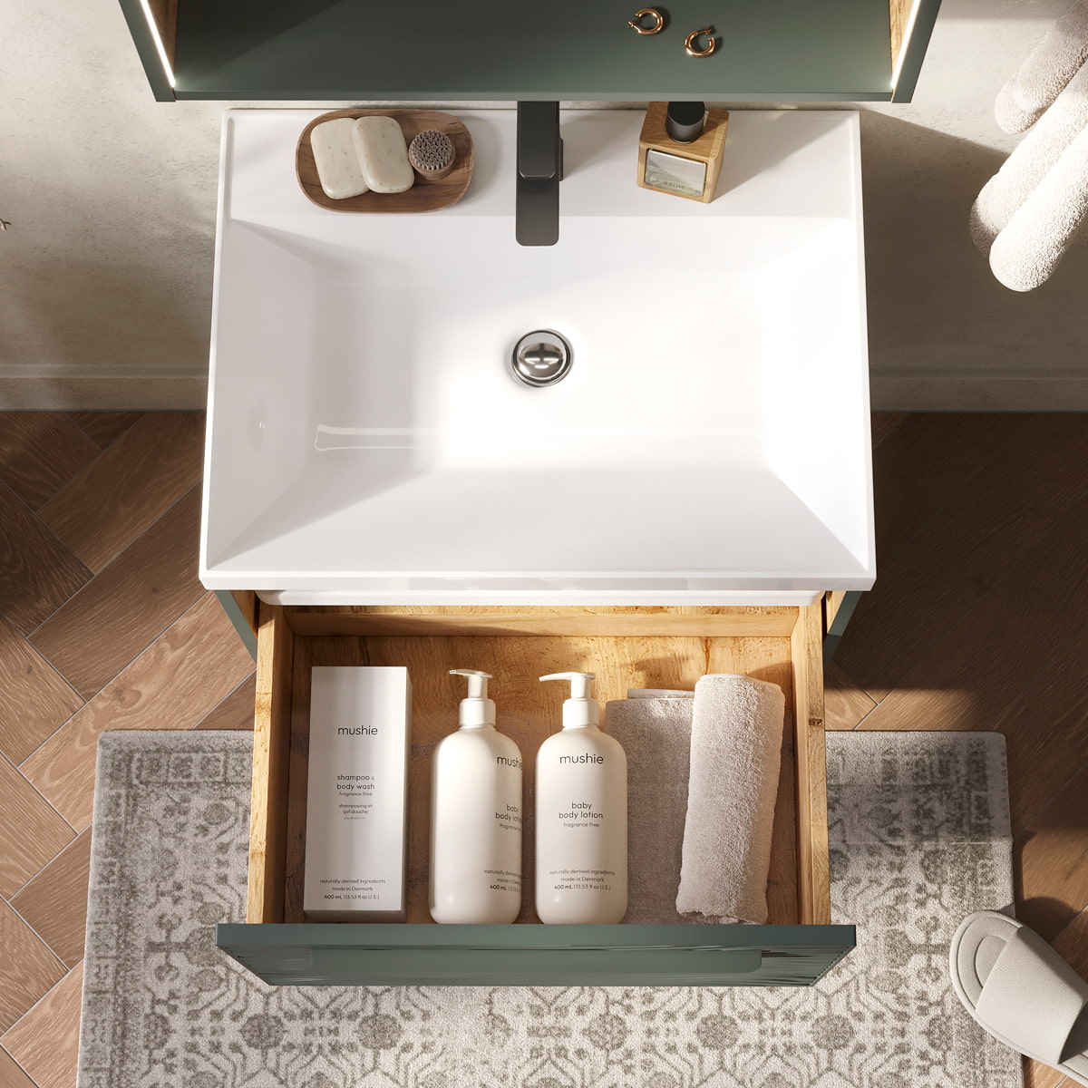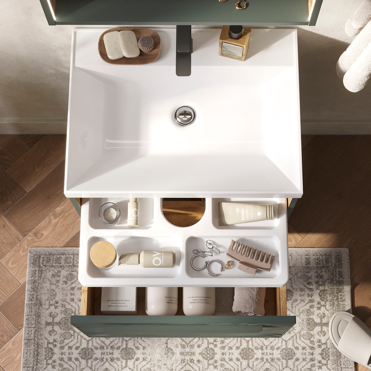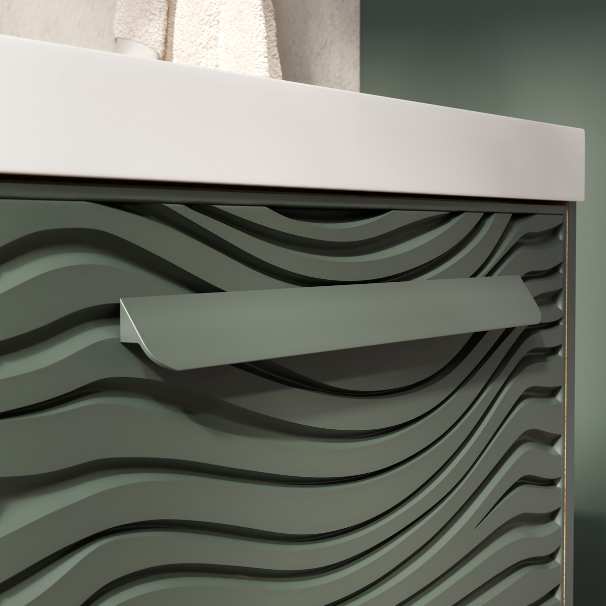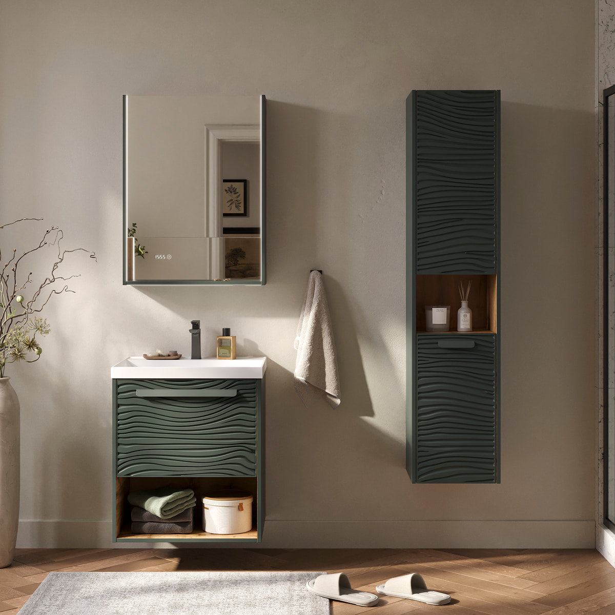 Подвесная тумба в цвете Зеленый камень/дуб вотан с открытой нишей, одним внешним выдвижным ящиком и встроенным выдвижным органайзером для оптимизации хранения из МДФ. Ящик открывается при помощи металлической ручки, окрашенной в цвет фасада. Направляющие скрытого монтажа внешнего ящика оснащены доводчиками для плавного закрывания. Фасад с декоративной фрезеровкой и корпус тумбы изготовлены из МДФ и облицованы матовой пленкой ПВХ с эффектом "Soft Touch". Комплектуется раковиной Prime 60, поставляется в комплекте с сифоном.