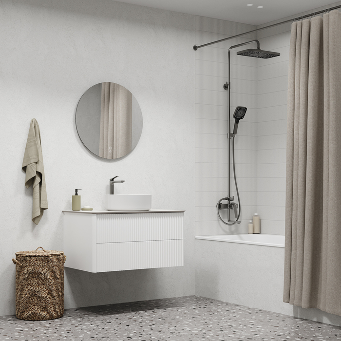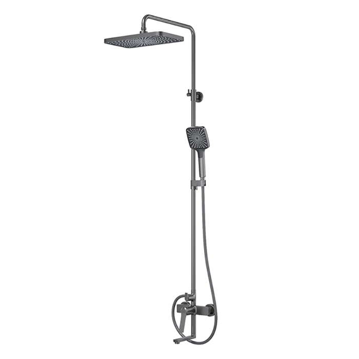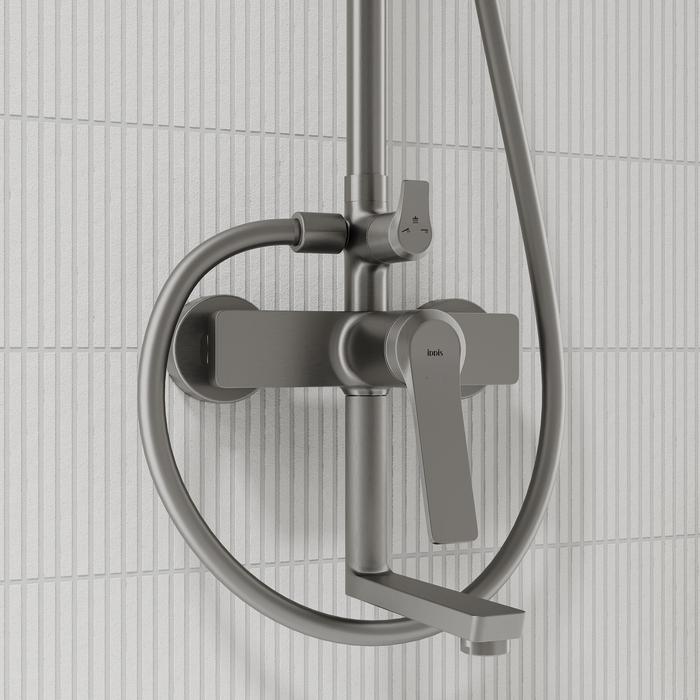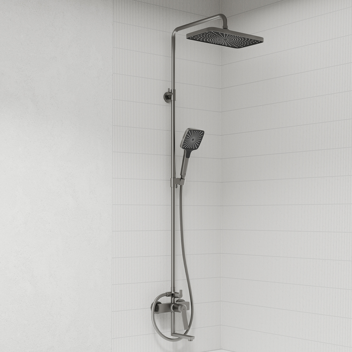 Душевая система Parker в матовом графитовом цвете с тропическим душем – практичная и стильная, ее дизайн сочетает в себе трендовый минимализм форм и четкие грани. Ручка изящно смотрит вверх под углом, освобождая под собой место для более удобного захвата. Необычный рисунок из форсунок на лейках в виде паутинки превращает душевую систему в красивый акцент ванной.
