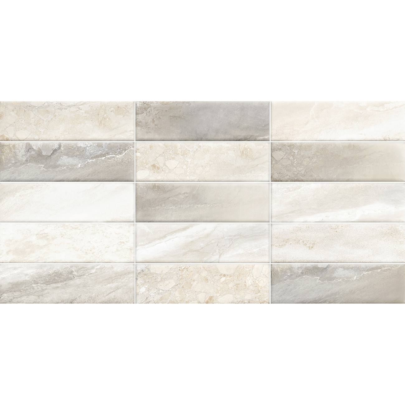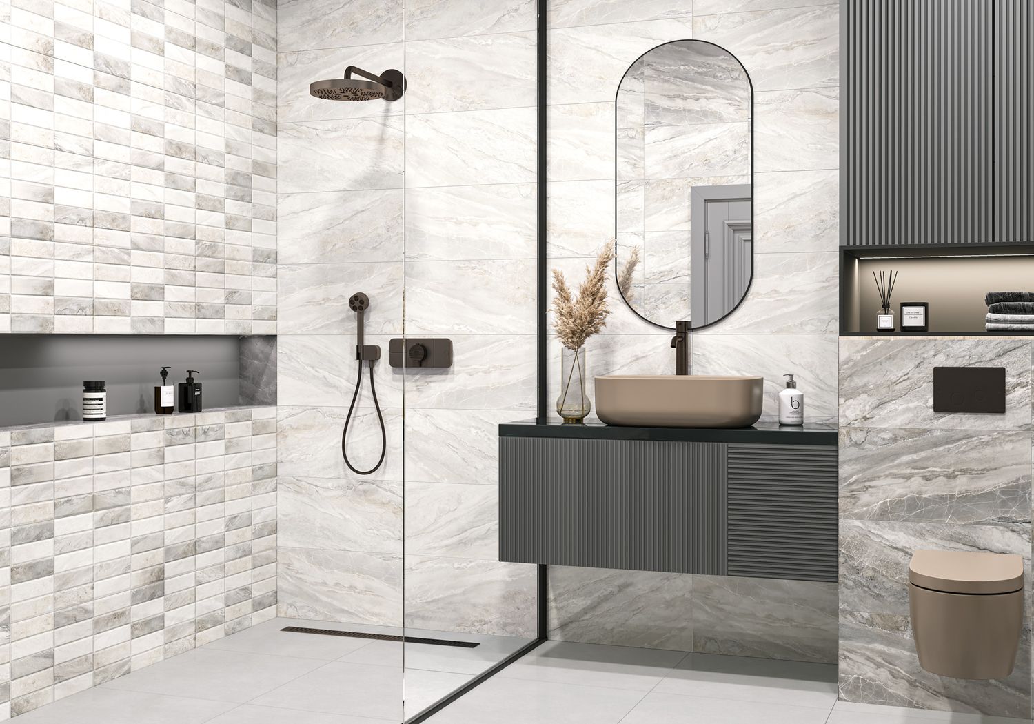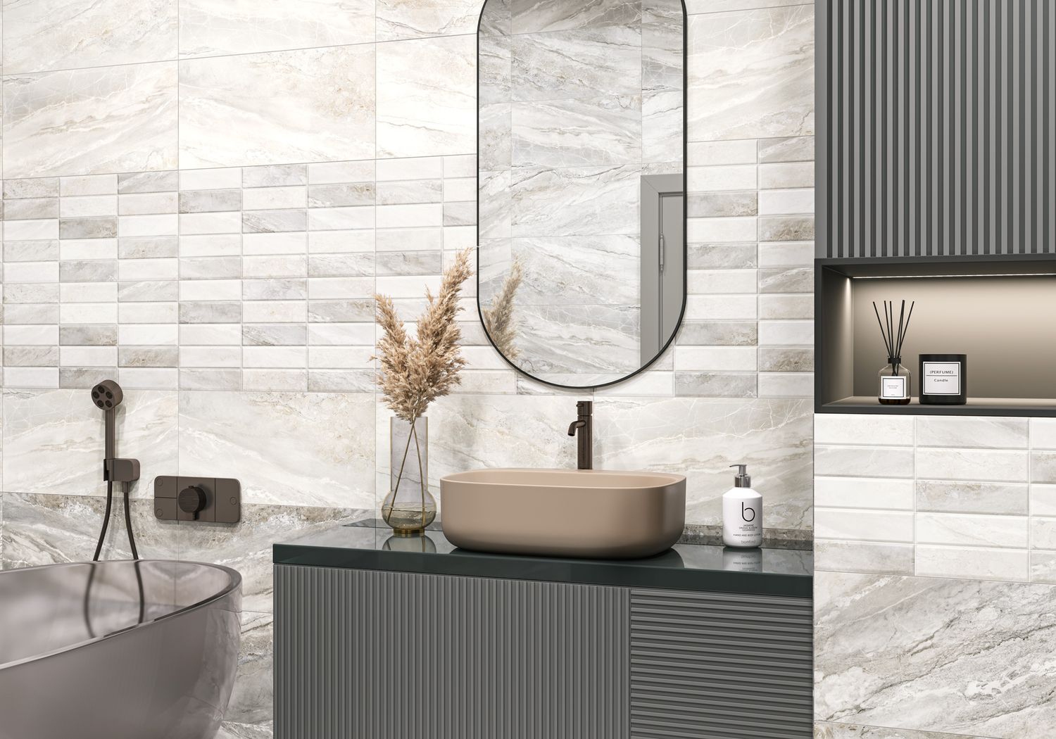Универсальный формат 300x600 мм с матовой поверхностью подходит как для просторных ванных комнат, так и для компактных санузлов, обеспечивая быструю и экономичную укладку. Ключевой элемент — декоративные массивы на рельефе «кирпичик». Они сохраняют мраморную текстуру в тон базовых плиток, но за счёт рельефа создают выразительный объём. С помощью этих элементов можно акцентировать стену, создав эффектную фокусную точку, добавив пространству сложности и художественной завершённости.