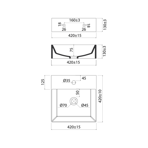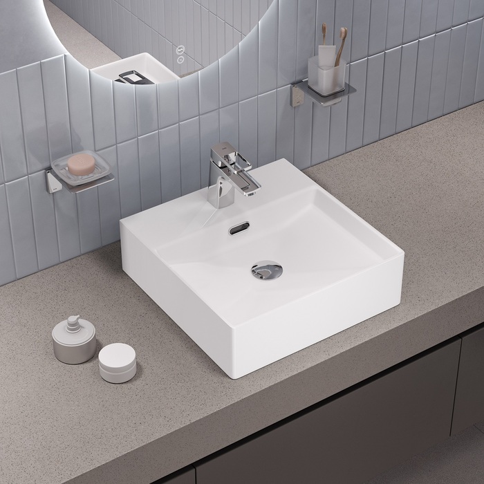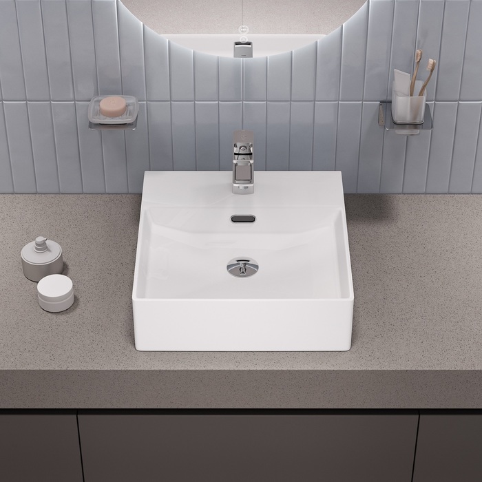 Встроенный перелив – страховка от потопа в ванной. Полочка на раковине – специальная утолщённая площадка (не просто отверстие в тонком бортике), предназначенная для монтажа стандартного смесителя. Не нужно искать специальную модель для накладного умывальника, подойдет большинство смесителей, представленных на рынке.
