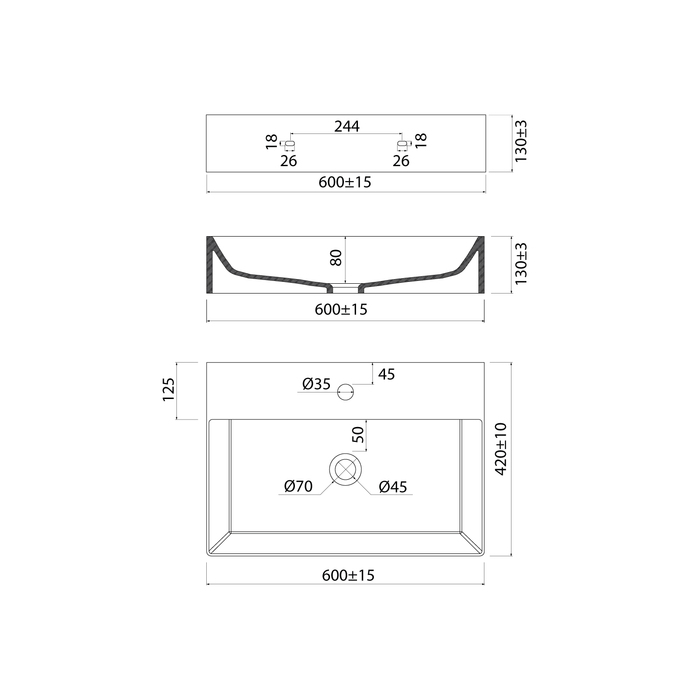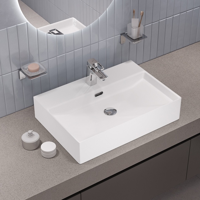 Встроенный перелив – страховка от потопа в ванной. Полочка на раковине – специальная утолщённая площадка (не просто отверстие в тонком бортике), предназначенная для монтажа стандартного смесителя. Не нужно искать специальную модель для накладного умывальника, подойдет большинство смесителей, представленных на рынке.
