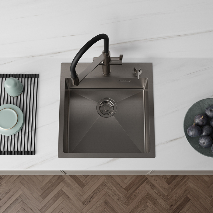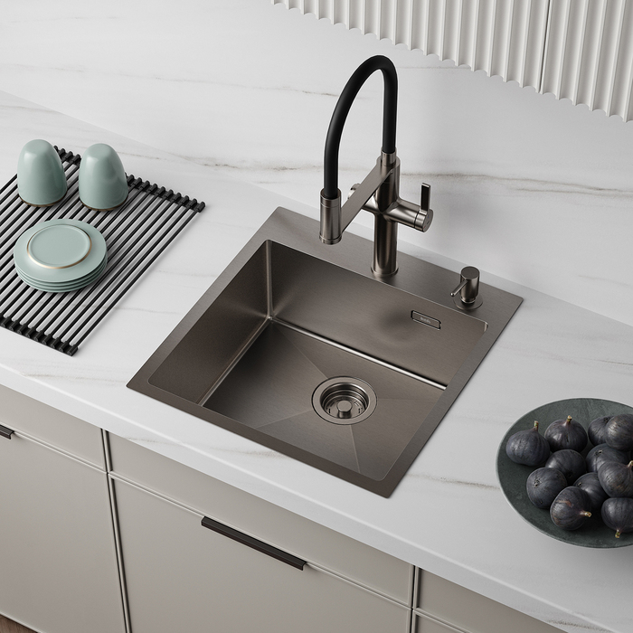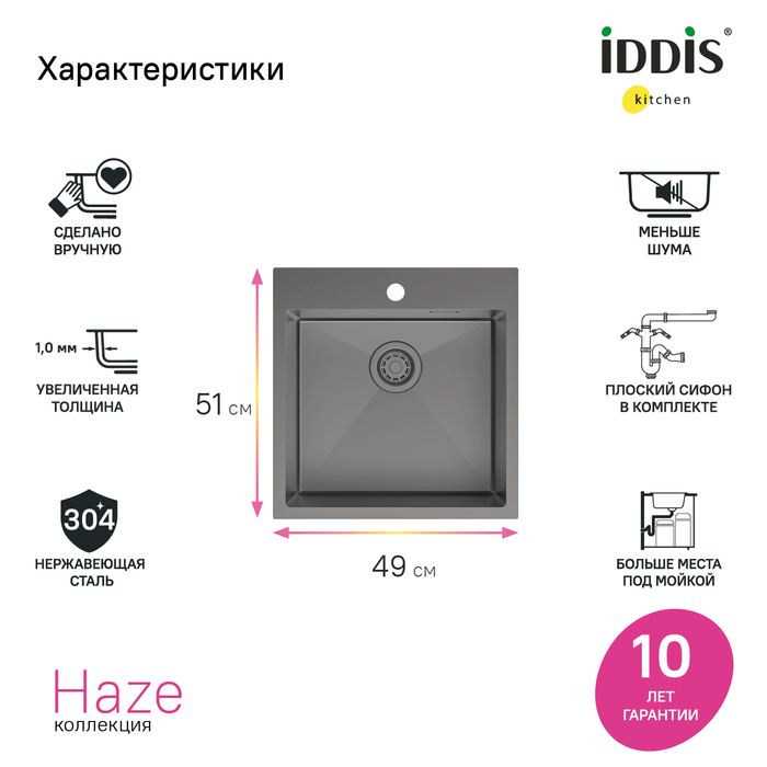 Мойка Haze отличается современным дизайном и ручным методом производства, что позволяет добиться идеальной геометрии – малый радиус скругления углов увеличивает рабочее пространство без «слепых» зон. Удобно разместить много посуды и мыть крупные предметы. Подходит для шкафа от 50 см. Глубина 20 см.