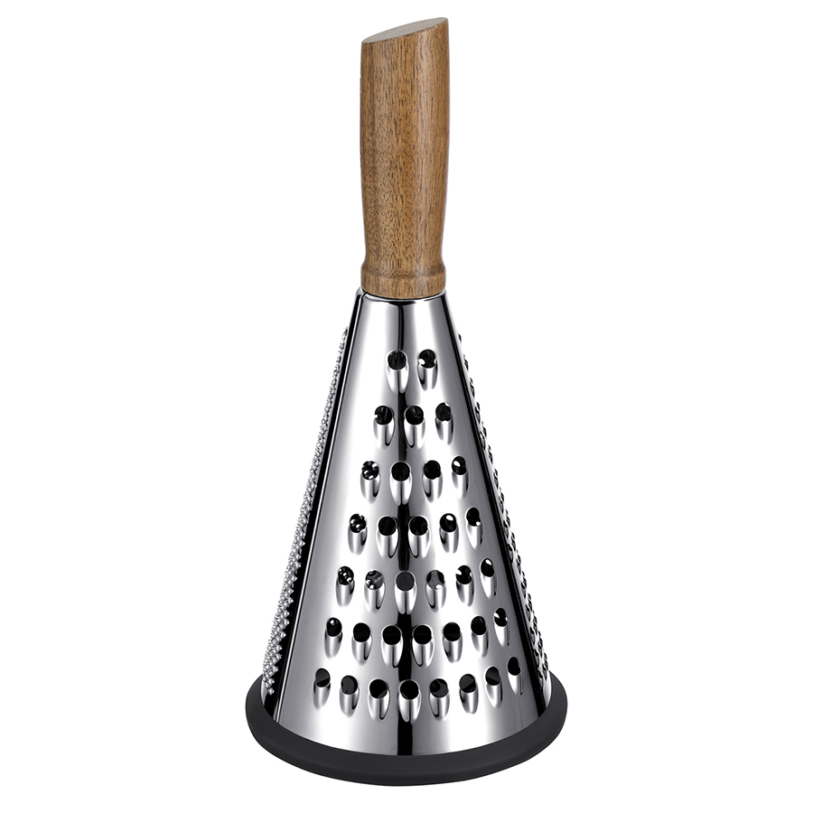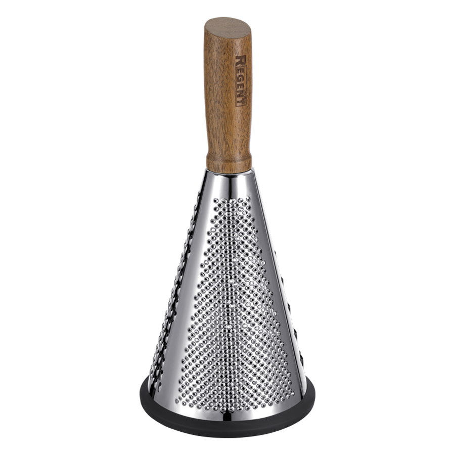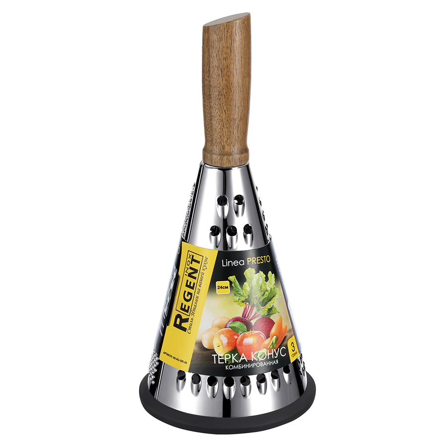 Терки ТМ Regent из нержавеющей стали с острой заточкой обладают противокоррозионными свойствами, обеспечивающими долгий срок службы, поэтому они станут лучшим подарком для тех, кто любит готовить дома легко и быстро. Изделие оснащено тремя режущими поверхностями для мелкой, средней и крупной нарезки. Нескользящие резиновые протекторы на основании предотвращают скольжение во время использования и защищают поверхность стола от повреждений. Деревянная ручка удобной формы не выскальзывает из рук даже при намокании.