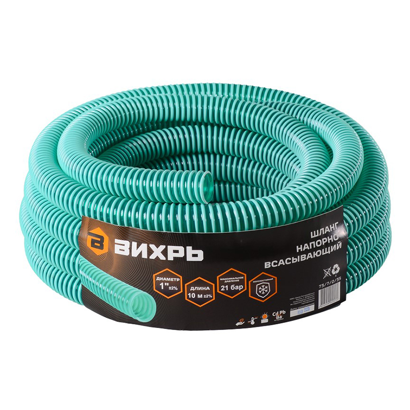 Шланг держит давление до 21 бар. Имеет диаметр 1" и длину 10 метров, что обеспечивает удобство в использовании и позволяет подключить его к различным насосам и другому оборудованию. Материал шланга экологически чистый, не содержит в составе кадмия, бария и свинца.