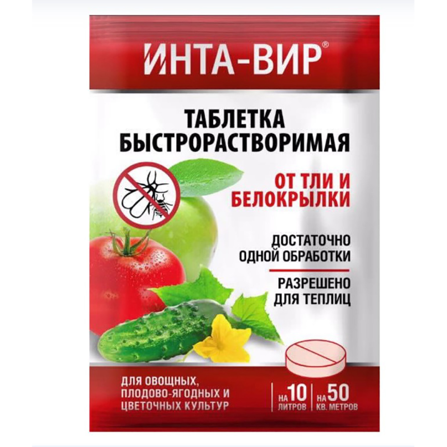 Инта-Вир — это популярное и проверенное средство для борьбы с комплексом насекомых-вредителей. Выпускается в виде водорастворимых таблеток, что делает его максимально удобным в применении. Препарат предназначен для уничтожения тли, белокрылки и других насекомых-вредителей в садах, огородах, теплицах. Применяется в период вегетации и интенсивного плодоношения растений при обнаружении личинок и взрослых особей на листьях растений. Безопасен для людей и животных.