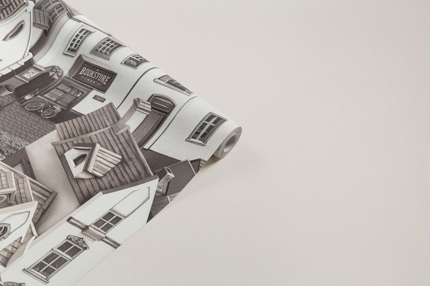 Многослойная архитектура европейских домиков создаёт ощущение настоящей городской панорамы. Разные планы рисунка формируют глубину, благодаря чему стены словно открывают вид на уютные улочки и маленькие площади.