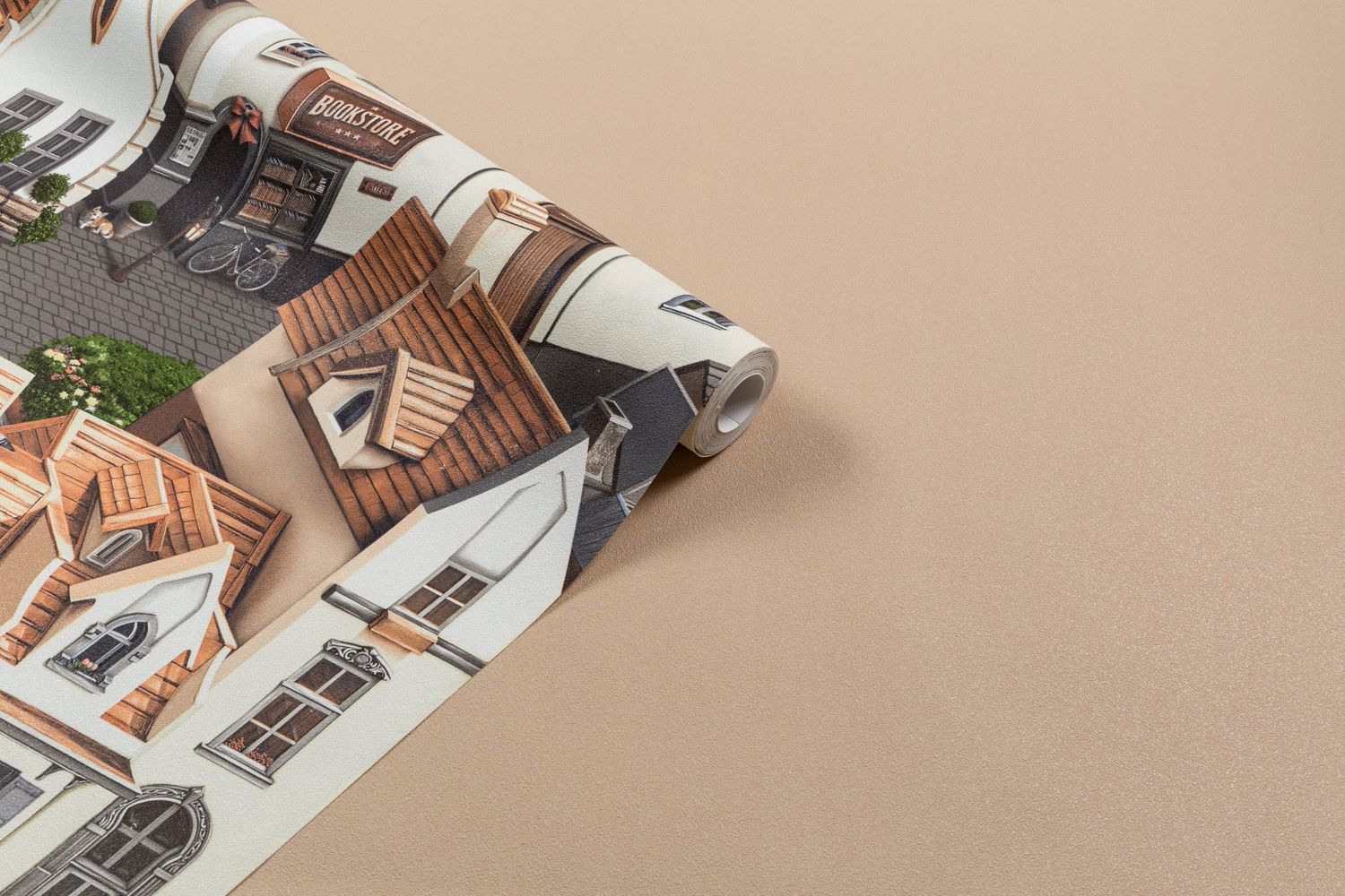 Многослойная архитектура европейских домиков создаёт ощущение настоящей городской панорамы. Разные планы рисунка формируют глубину, благодаря чему стены словно открывают вид на уютные улочки и маленькие площади.
