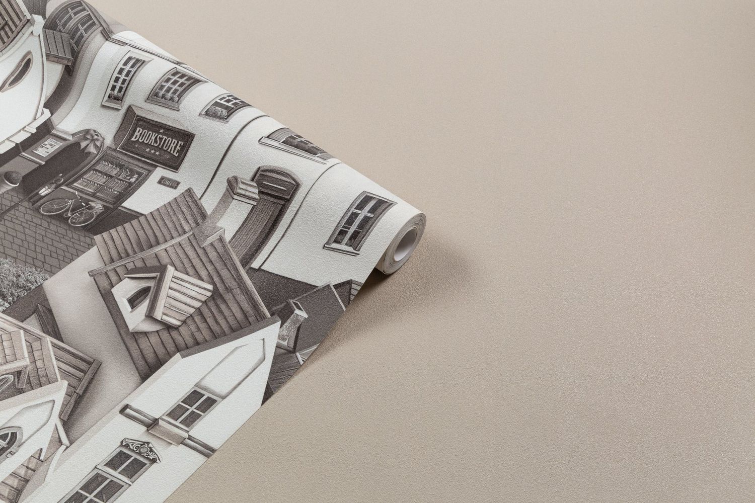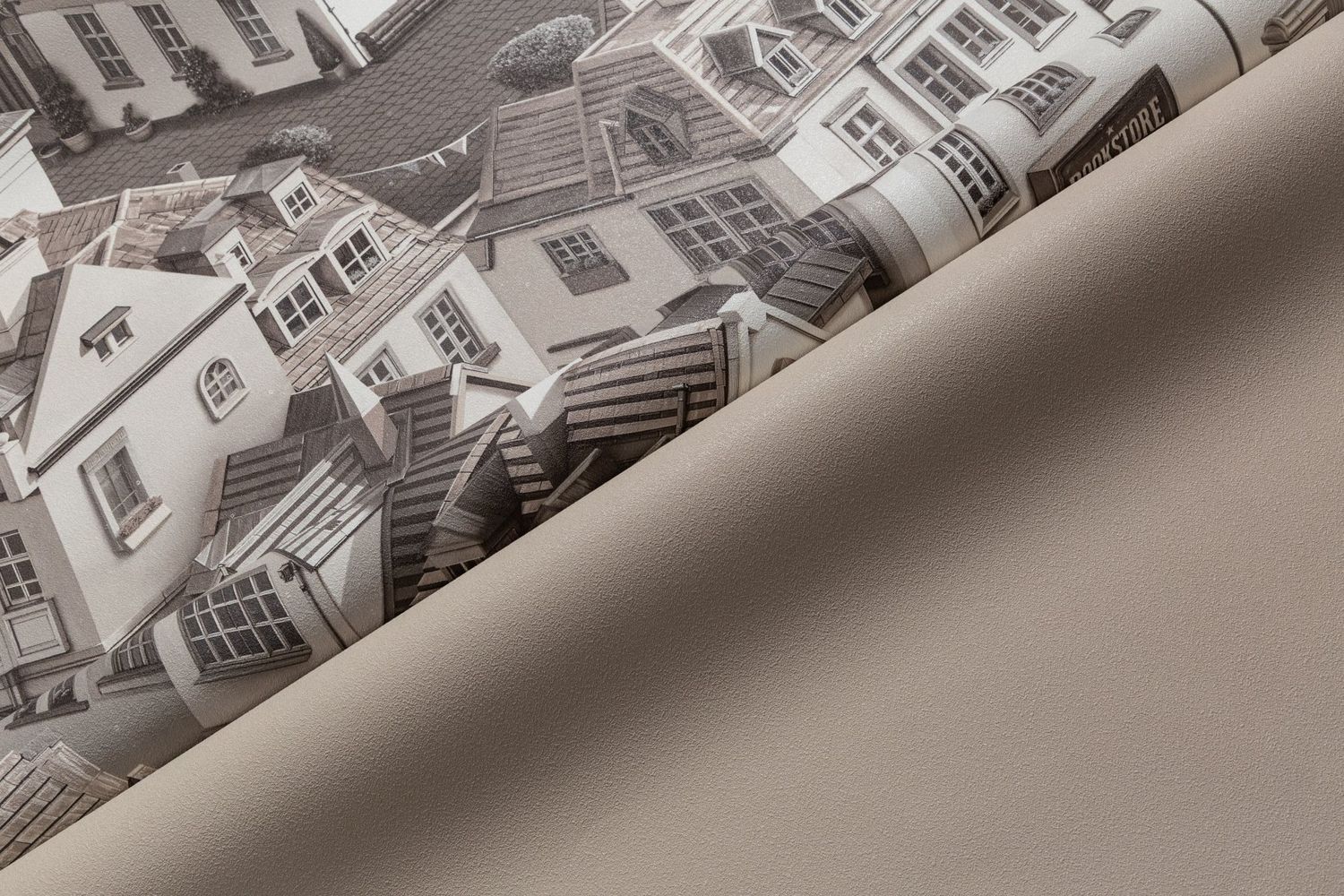 Многослойная архитектура европейских домиков создаёт ощущение настоящей городской панорамы. Разные планы рисунка формируют глубину, благодаря чему стены словно открывают вид на уютные улочки и маленькие площади.