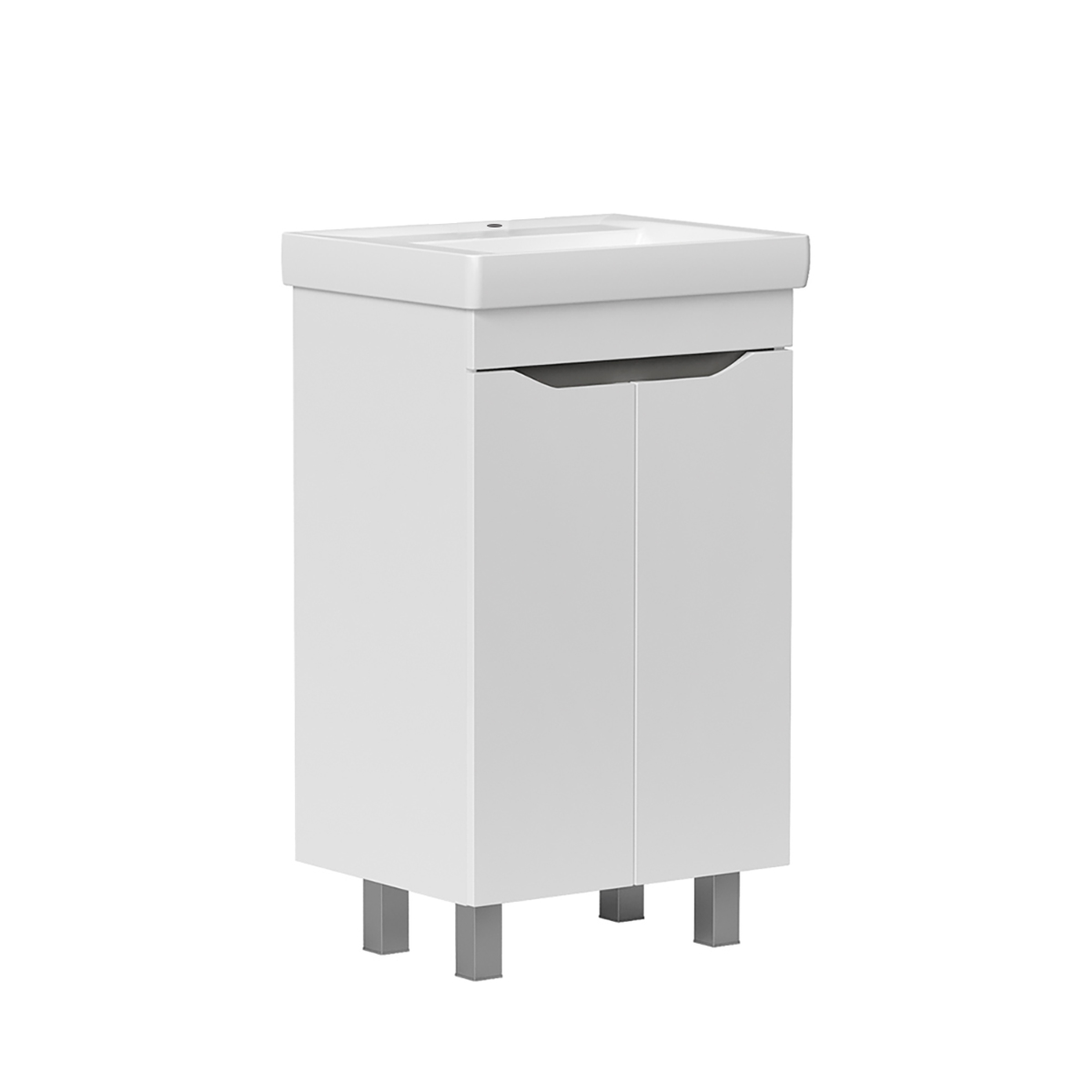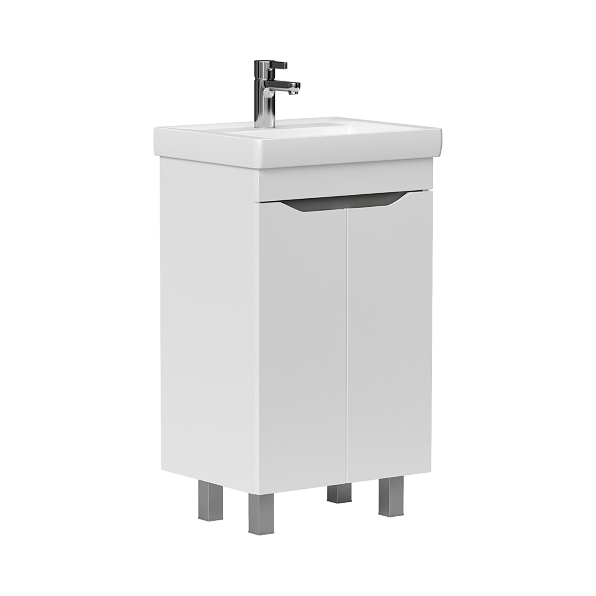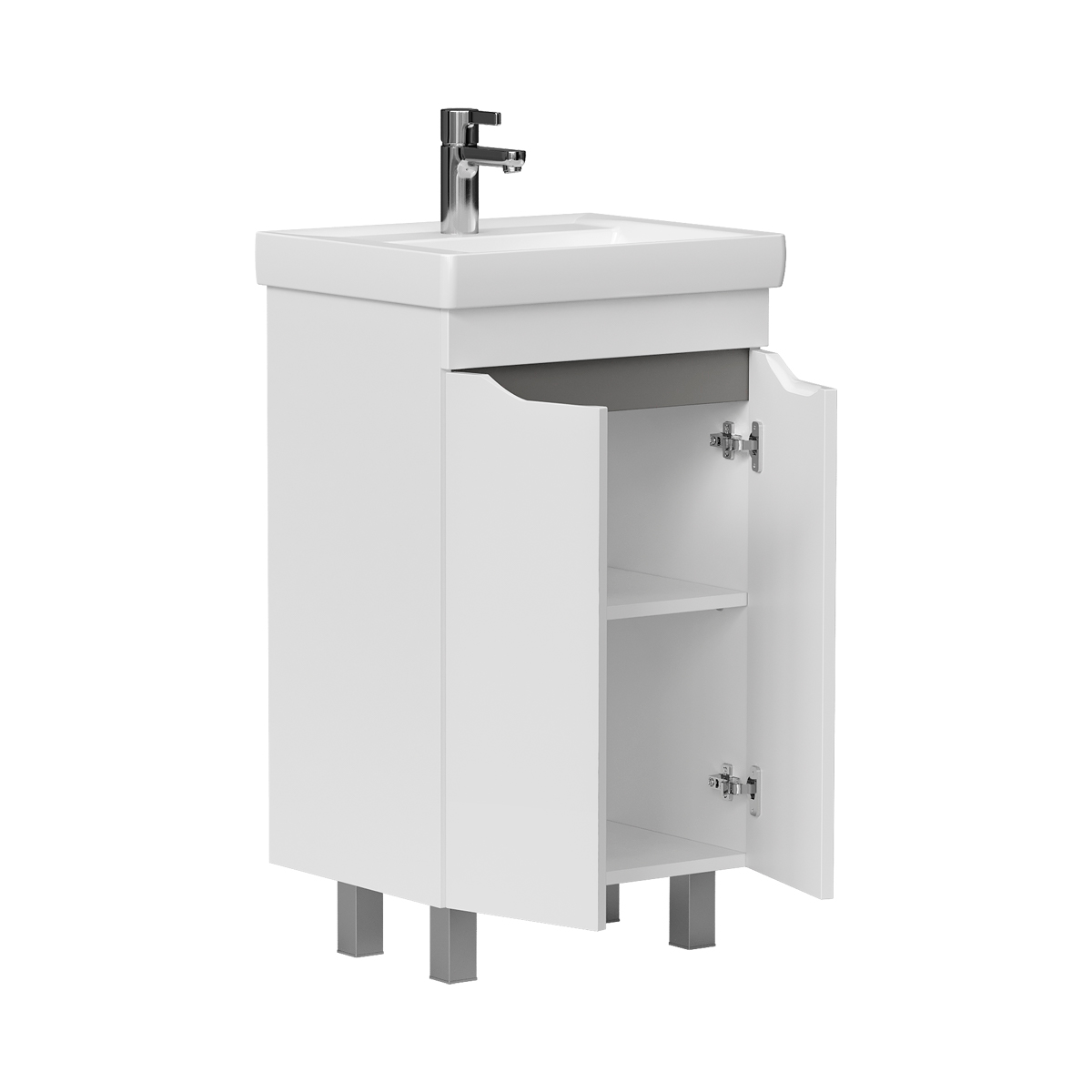 Напольная тумба с двумя распашными дверцами. Внутри полка из ЛДСП. Петли на дверцах оснащены доводчиками. Дверцы тумбы изготовлены из МДФ, облицованы глянцевой пленкой ПВХ. Дверцы открываются при помощи интегрированных ручек. Тумба устанавливается на четыре регулируемые опоры (две лицевые и две монтажные) и фиксируется к стене при помощи креплений. После установки монтажные опоры можно убрать.