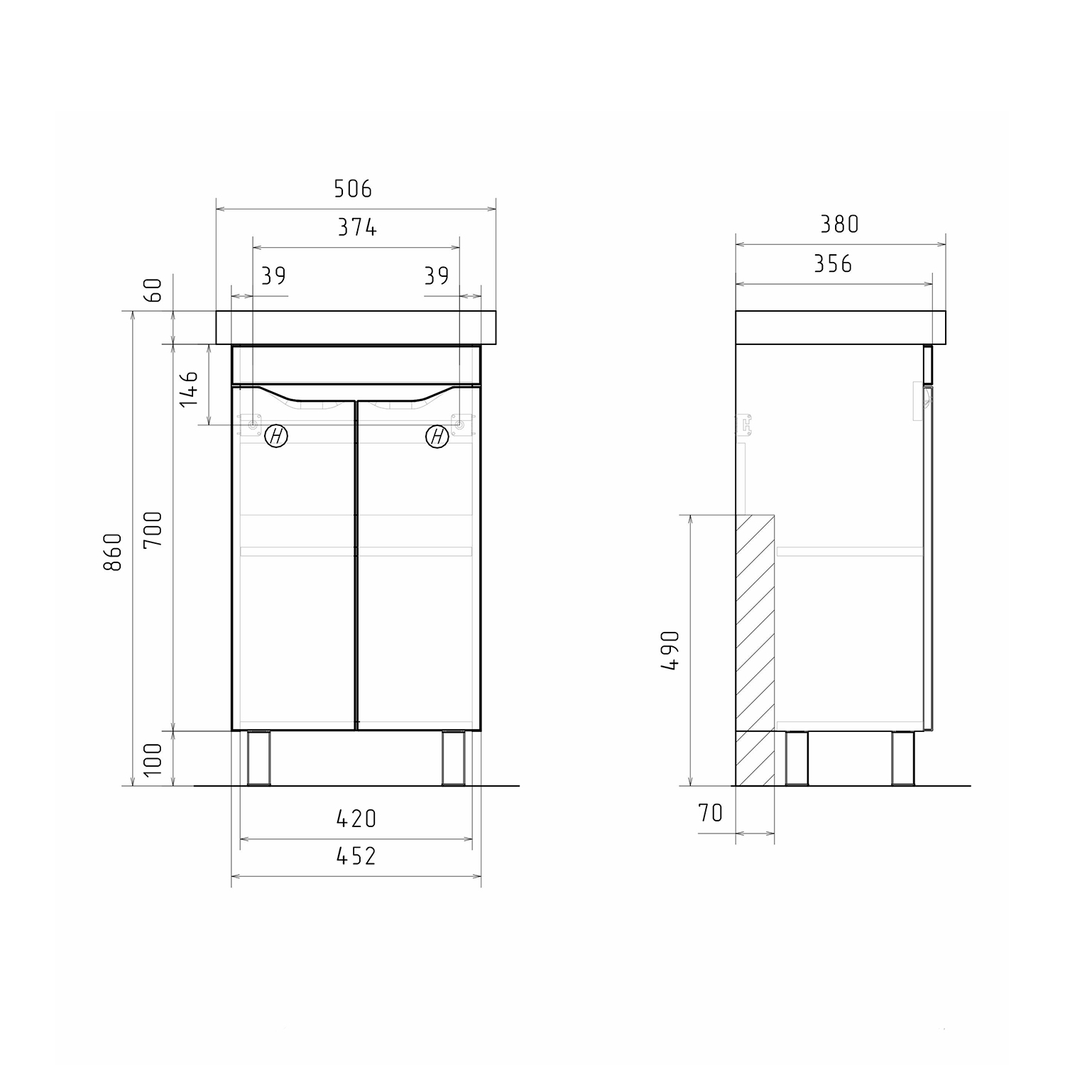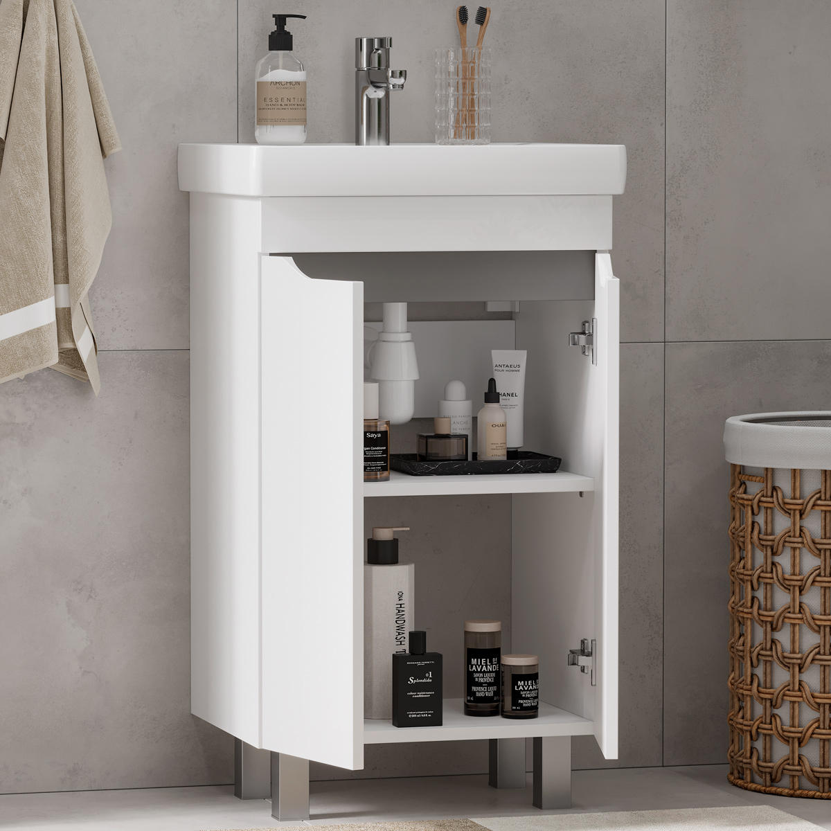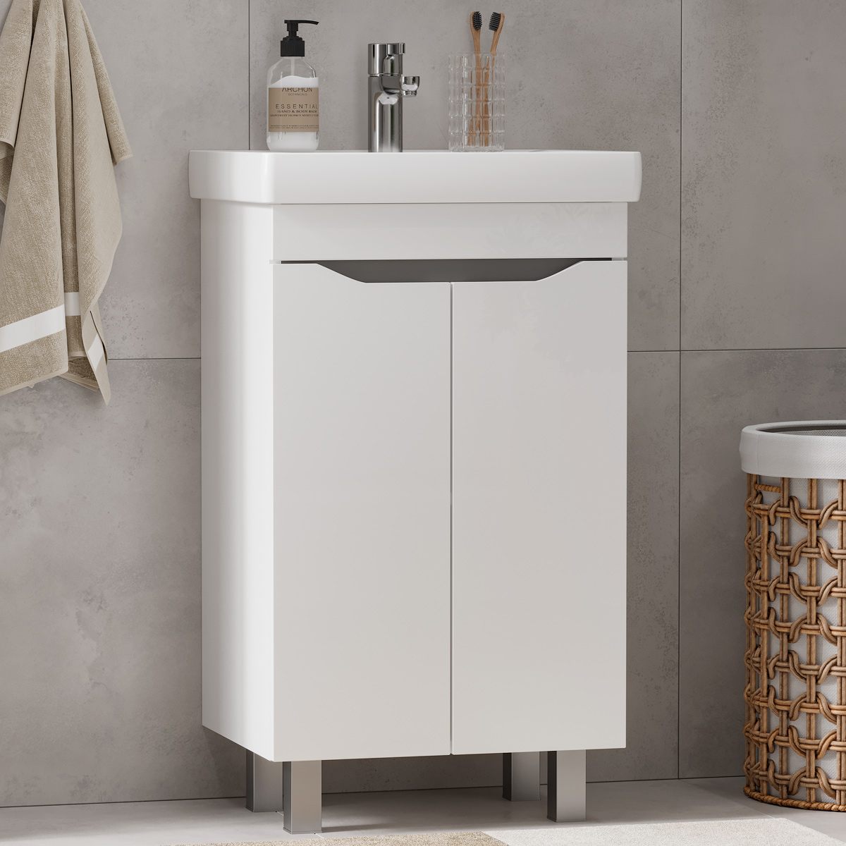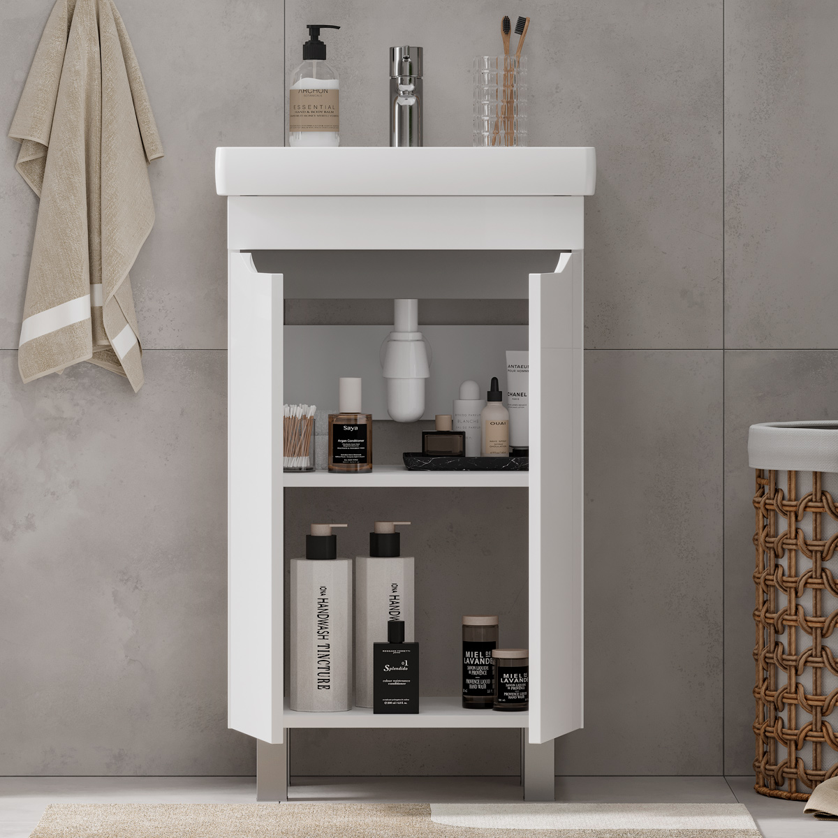 Напольная тумба с двумя распашными дверцами. Внутри полка из ЛДСП. Петли на дверцах оснащены доводчиками. Дверцы тумбы изготовлены из МДФ, облицованы глянцевой пленкой ПВХ. Дверцы открываются при помощи интегрированных ручек. Тумба устанавливается на четыре регулируемые опоры (две лицевые и две монтажные) и фиксируется к стене при помощи креплений. После установки монтажные опоры можно убрать.